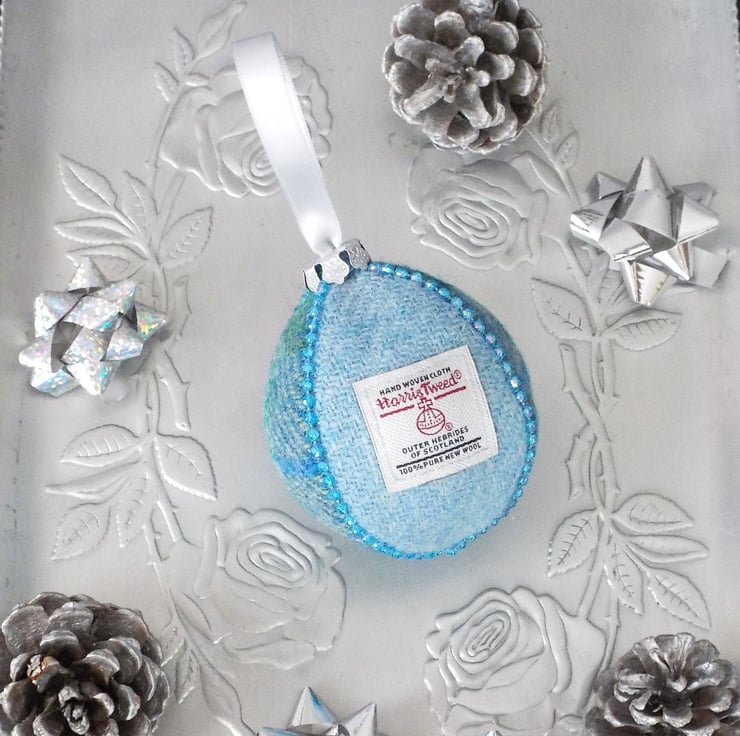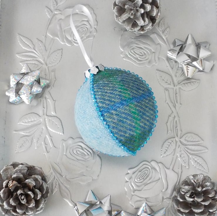 Christmas tree decoration handmade at Roses Workshop from Harris tweed hand-woven fabric. I have created this lovely bauble with four segments of fabric, alternating plain pale blue with blue and green tartan hand-stitched together. Then I have decorated the segment seams with bead ribbon, also hand-stitched into place.