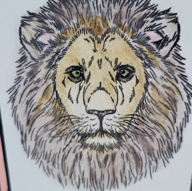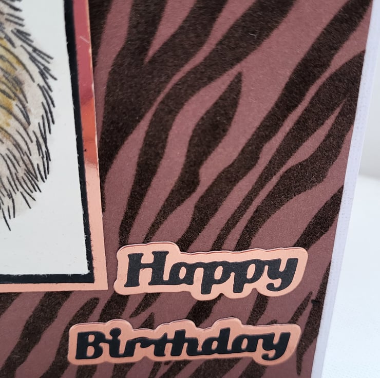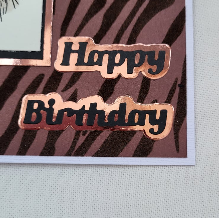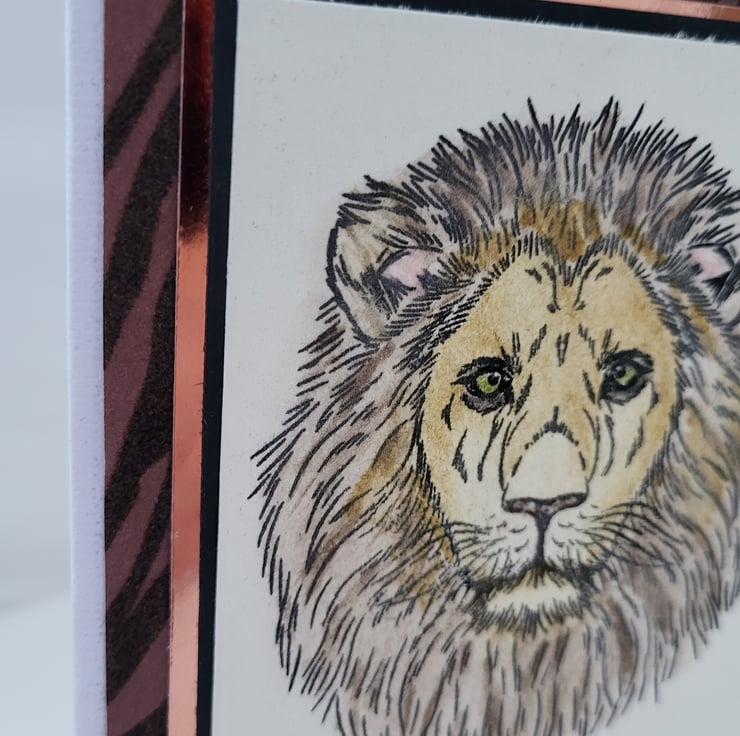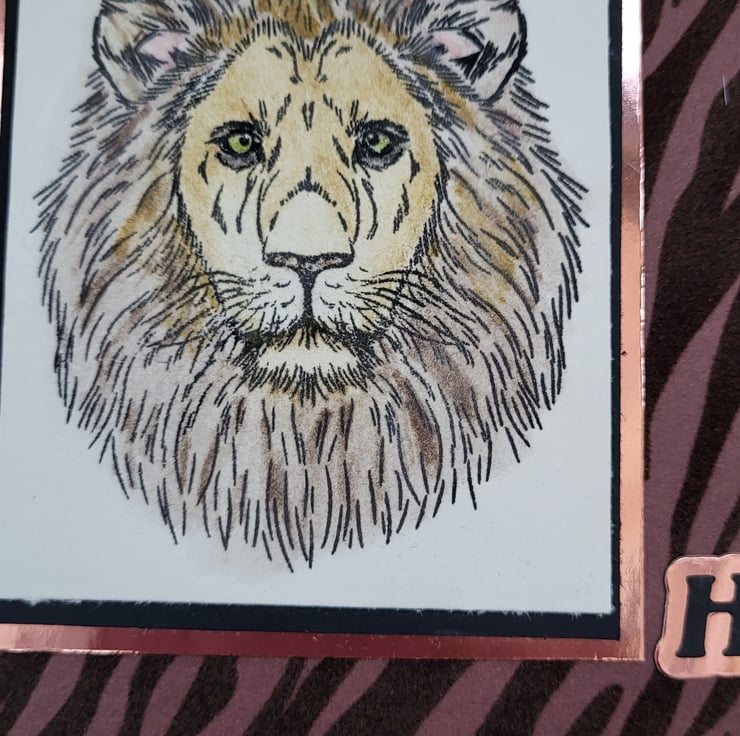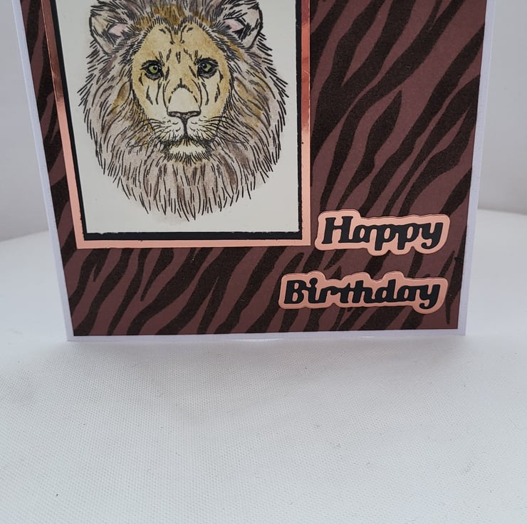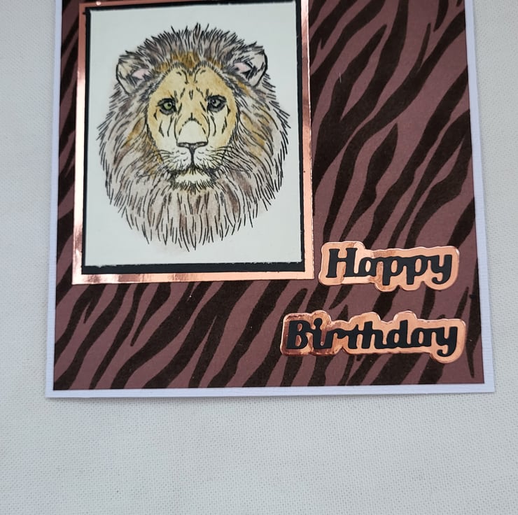 This handmade card measures approx 6 6 Inches. It has a handstamped lion on the front which I have coloured in using watercolour pencils. I have then layered the image onto black card, then gold mirror card then onto flock tiger print card. I have added a happy birthday sentiment on the front. This card has been left blank inside for your own message.