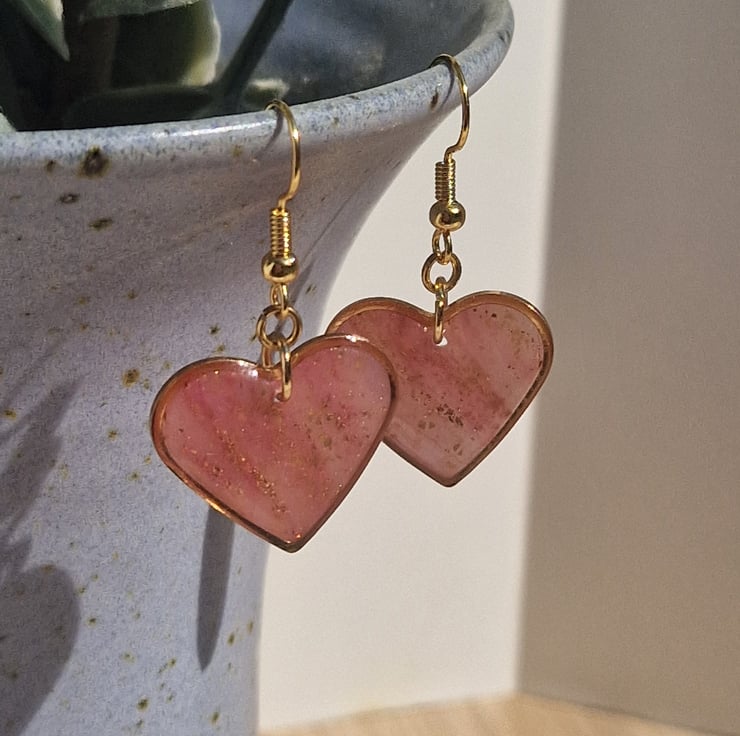 Handmade with care, these heart shaped bezel earrings are crafted from lightweight polymer clay, making them comfortable enough to wear all day. Each pair is unique, no two are exactly the same, giving you a truly one-of-a-kind accessory. Approximately 40mm long. Hypoallergenic hooks.