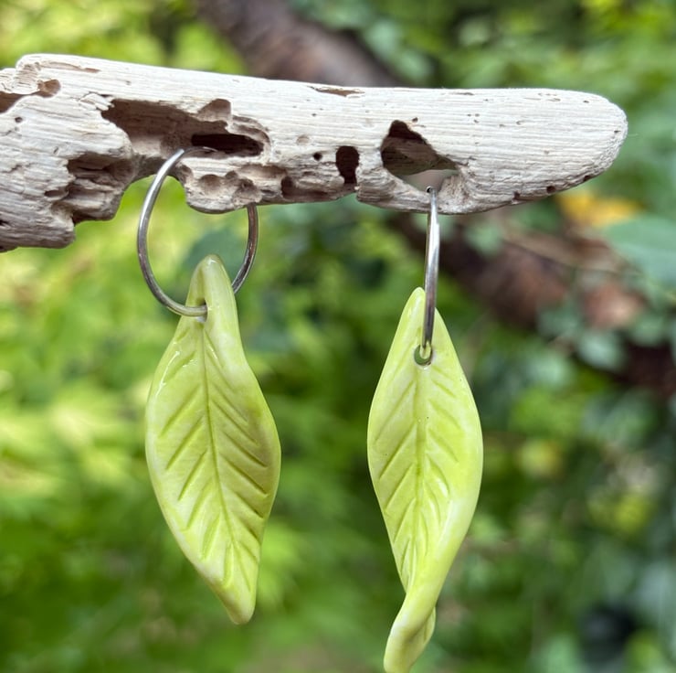 These charming hand-crafted porcelain leaf earrings hang boldly from elegant sterling silver endless hoops. They make the perfect addition to your jewellery collection and work brilliantly from day to evening wear.