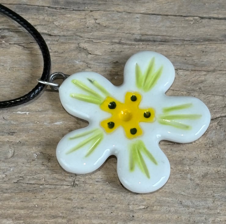 This handmade porcelain pendant flower necklace has been hand-sculpted with embossed details before being hand-painted and then gloss glazed on both sides. It has been fired twice making it durable and easy to clean.