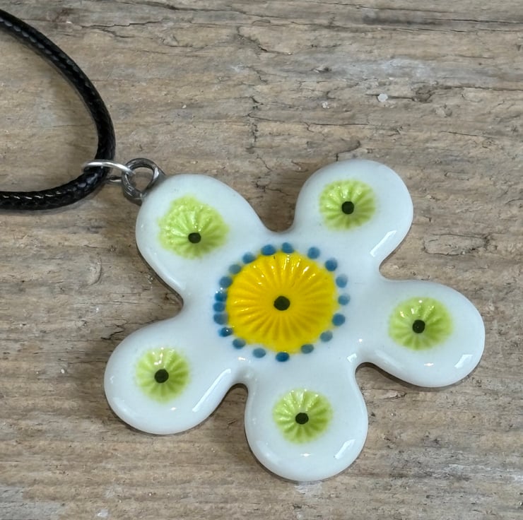 This handmade porcelain pendant flower necklace has been hand-sculpted with embossed details before being hand-painted and then gloss glazed on both sides. It has been fired twice making it durable and easy to clean.