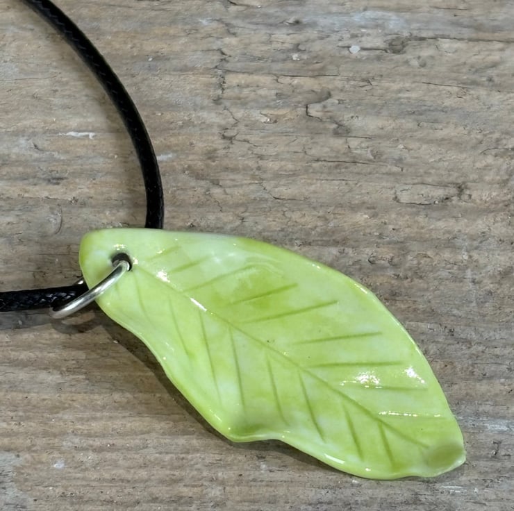This handmade porcelain leaf pendant necklace has been hand-sculpted with leaf vein details before being hand-painted and then gloss glazed on both sides. It has been fired twice making it durable and easy to clean.