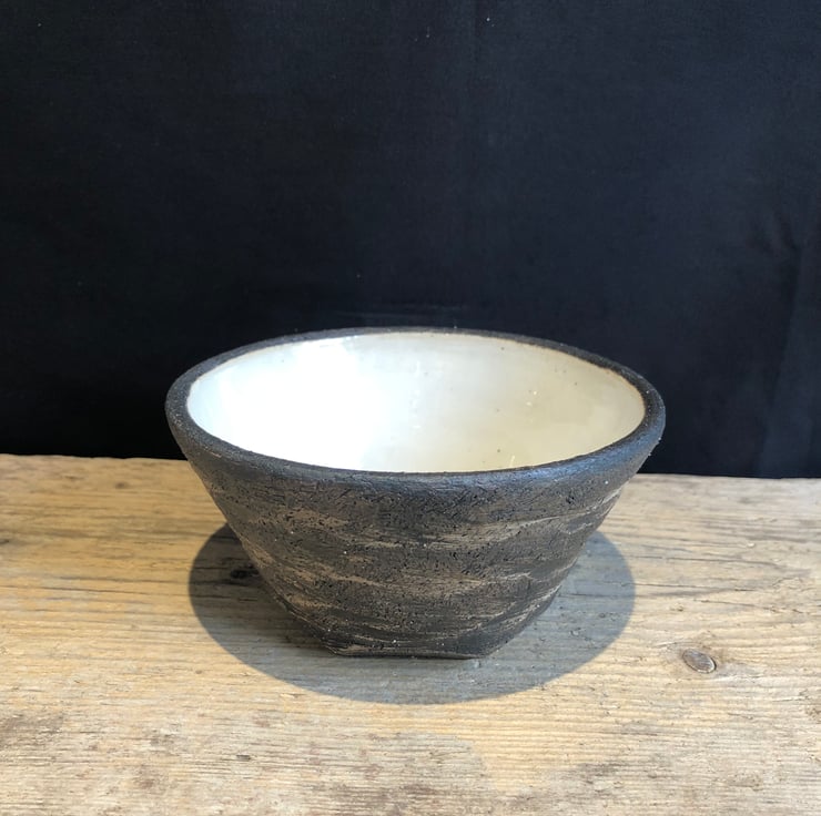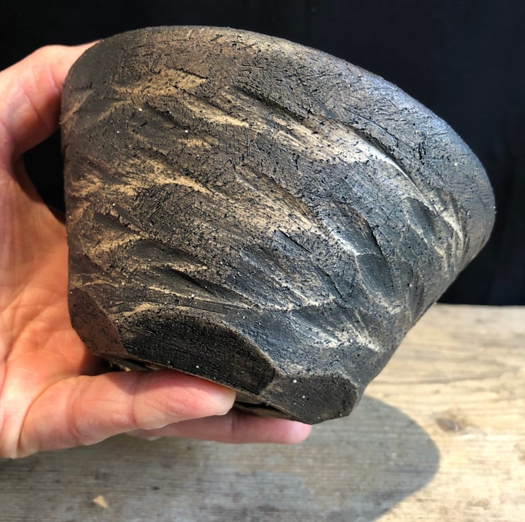This speckled stoneware bowl has been wheel-thrown - left smooth on the inside and then carved on the outside. Once bisque fired (the first firing), I applied black underglaze to the texture which was then wiped back to create depth.