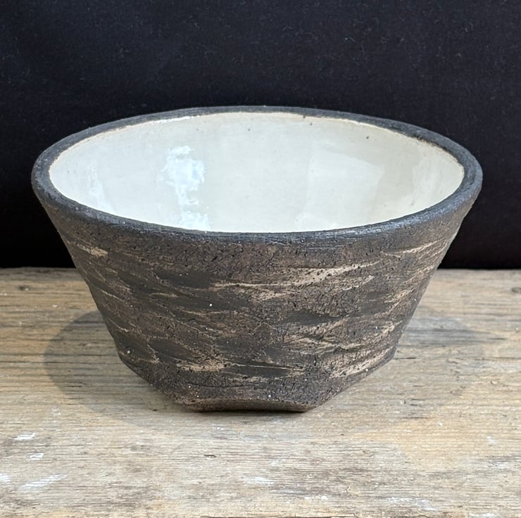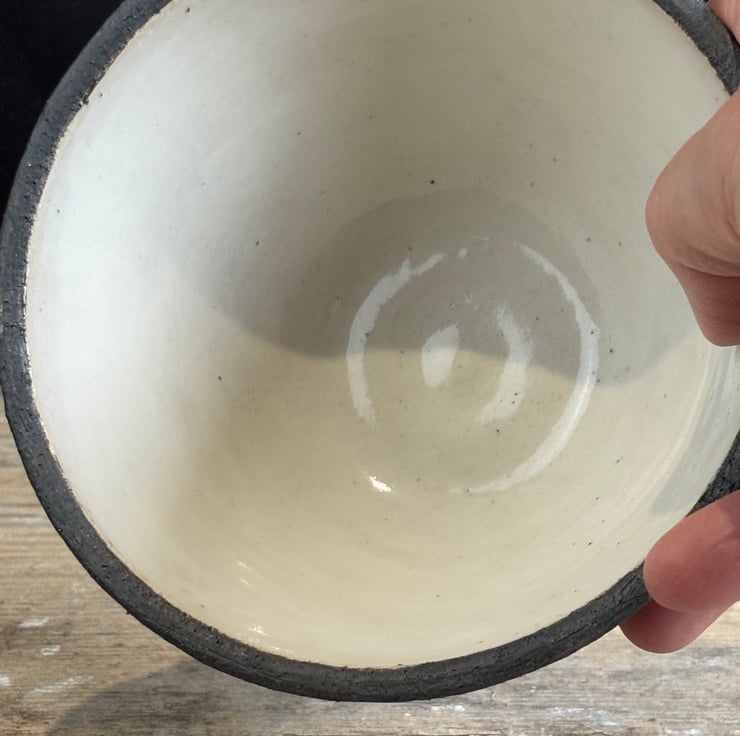 The inside was glazed with a glossy white glaze which shows some of the speckles of the glaze.