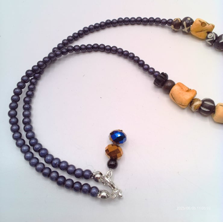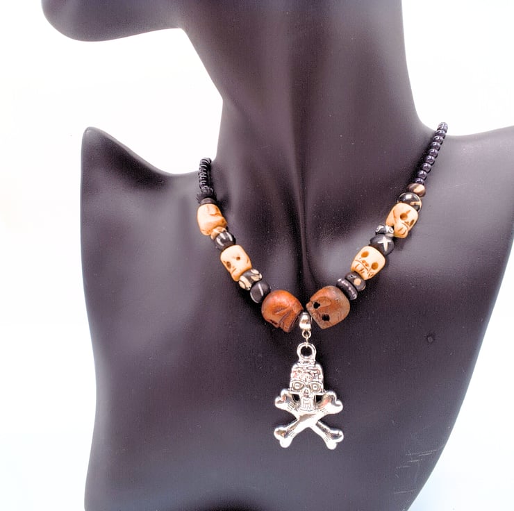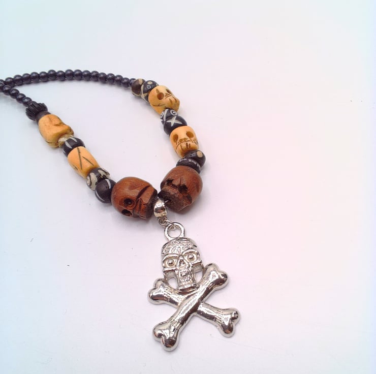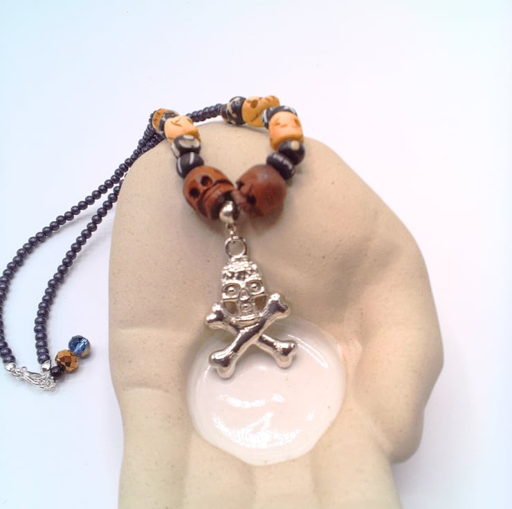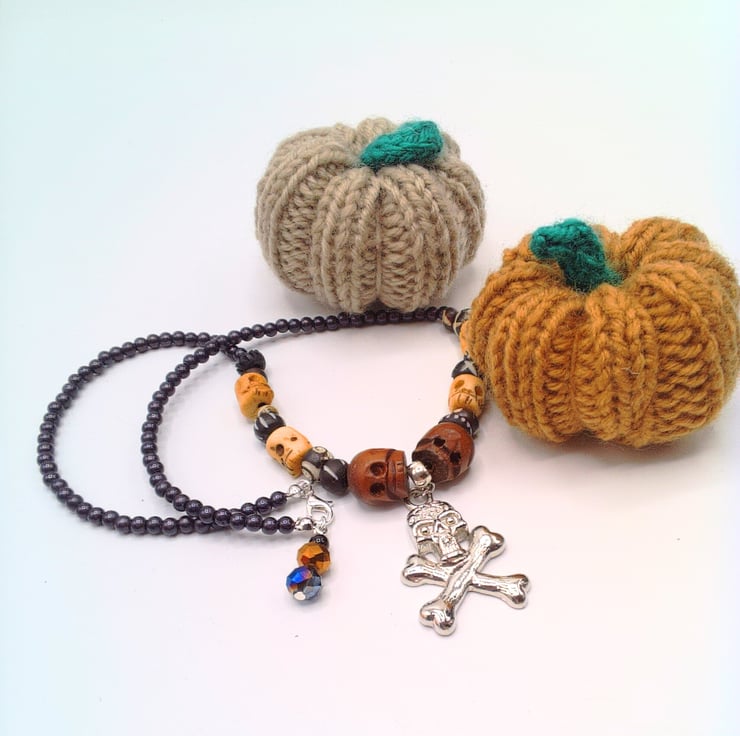 This fun, chunky pendant on a purple bead and skull bead necklace would make a great Halloween gift for relatives or friends or for yourself. It would go well with any outfit that you choose for your Halloween party or other event. The skull and crossbones skull charm is silver plated and measures 3.5 cm x 2.5 cm. It is suspended on an 18 inch (46 cm) necklace made with 3 mm purple miracle beads, 12 mm x 10 mm wooden skull beads, 10 mm x 8 mm bone skull beads and an assortment of black beads with white markings. It has a beaded drop made with blue and gold crystals and a black glass bead at the back. The pendant will be dispatched wrapped in tissue paper in an organza bag and delivered to you via Royal Mail first class post.