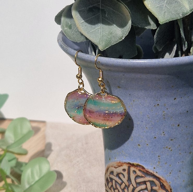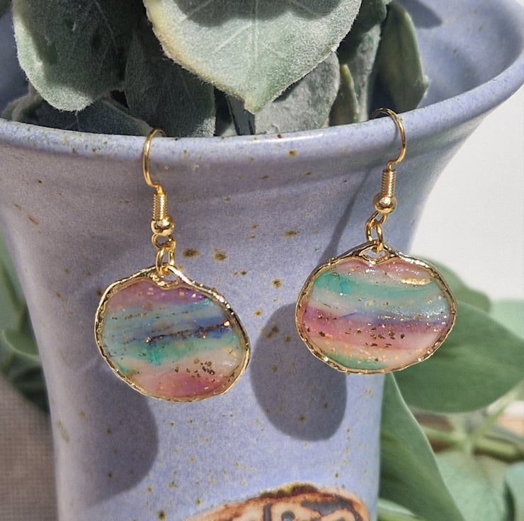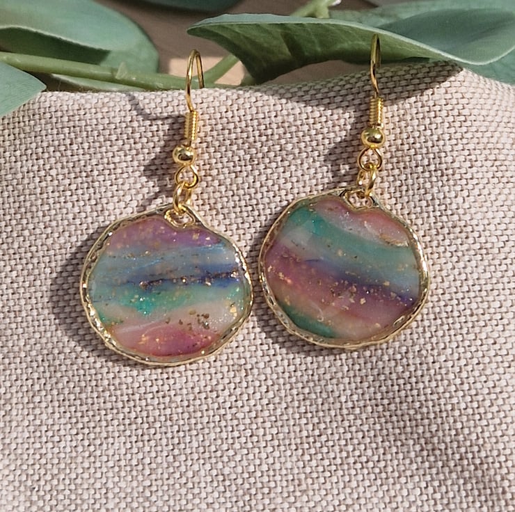 Handmade with care, these bezel earrings are crafted from lightweight polymer clay, making them comfortable enough to wear all day. Each pair is unique, no two are exactly the same, giving you a truly one-of-a-kind accessory. Approximately 40mm long. Hypoallergenic hooks.