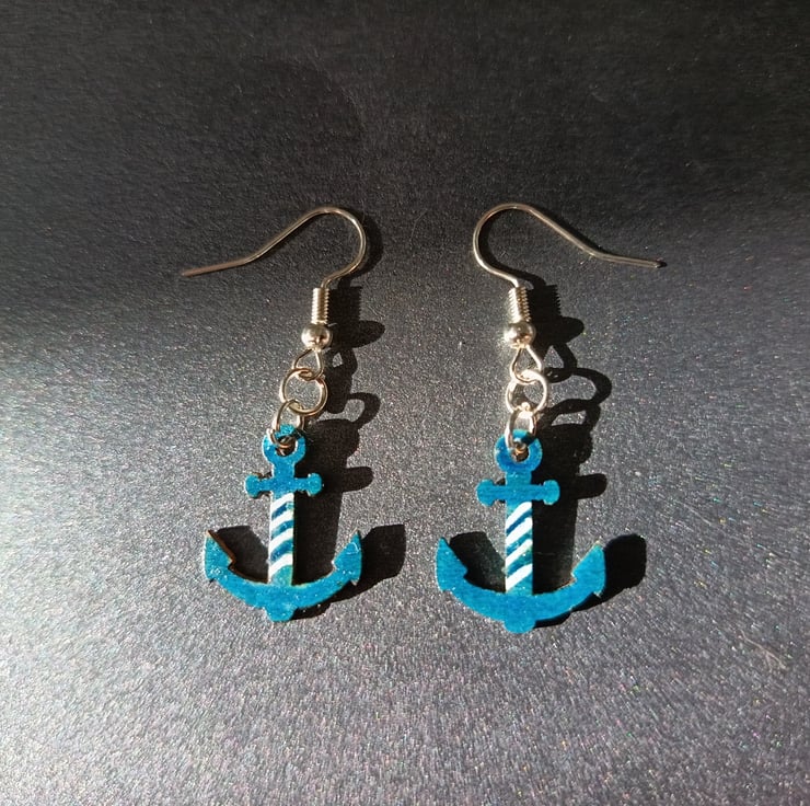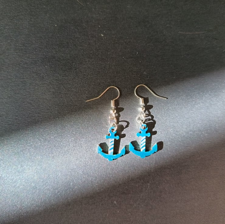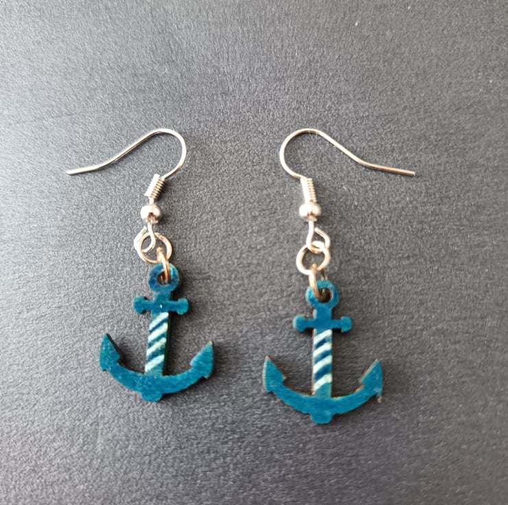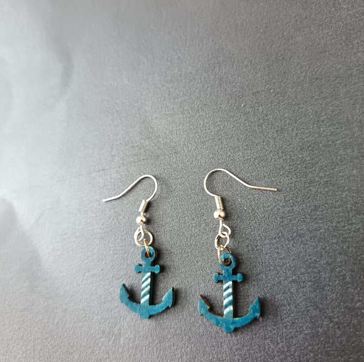 These handmade earrings are made from wooden anchor charms and stainless steel hooks. The wooden charms are hand-painted blue with four white stripes on the front side for a nautical theme (plain blue on the back) and finished with varnish for durability.