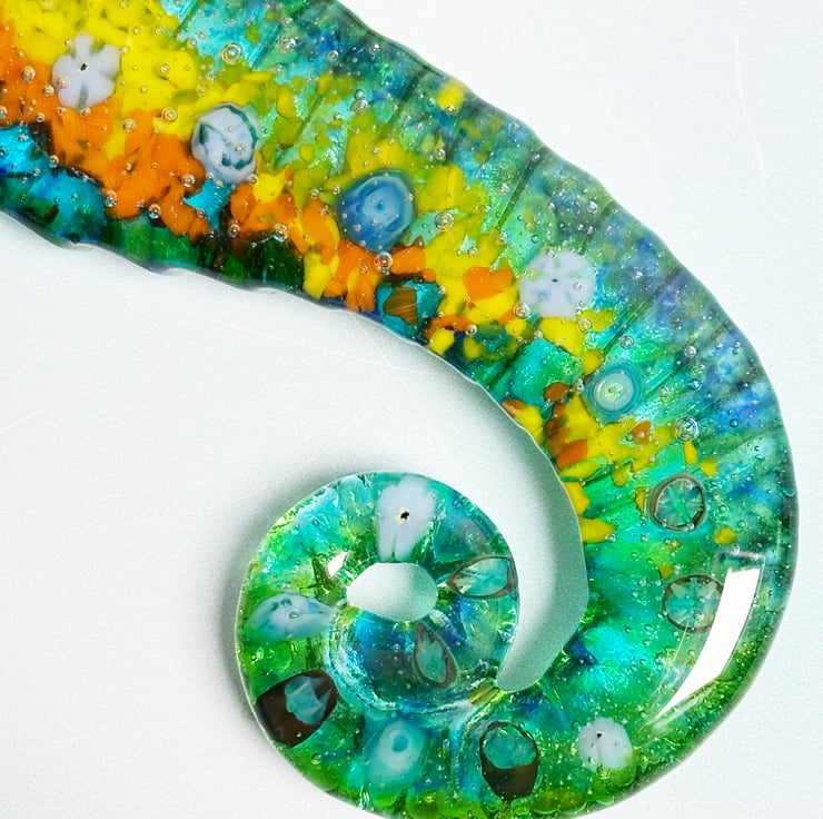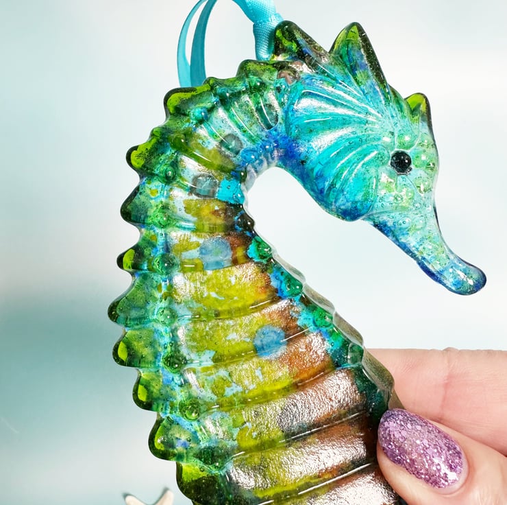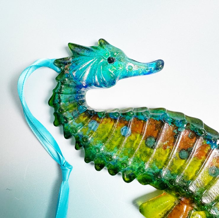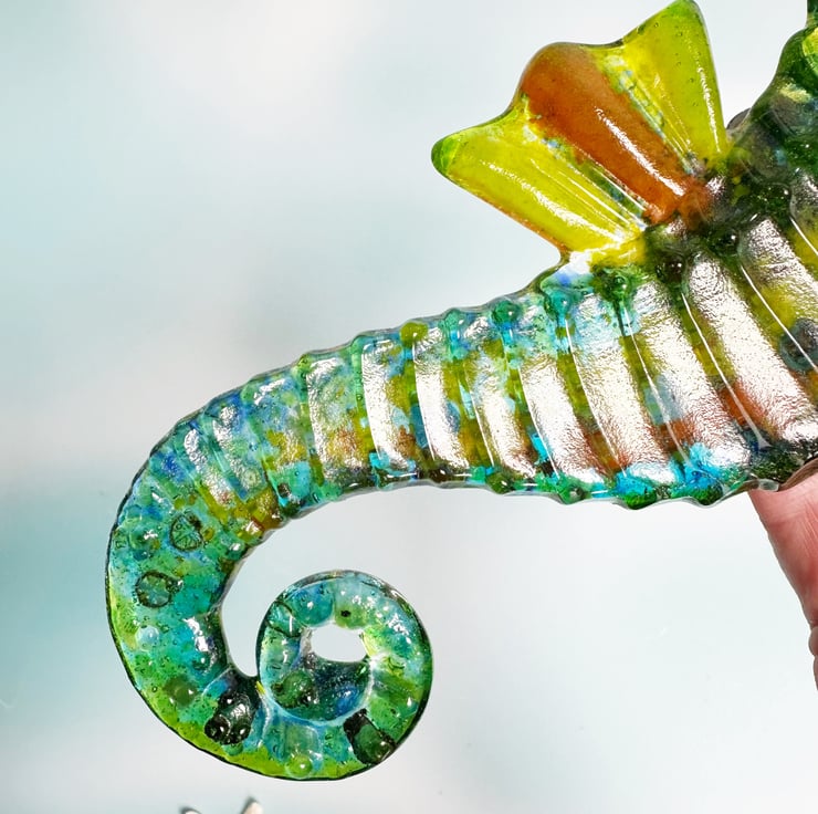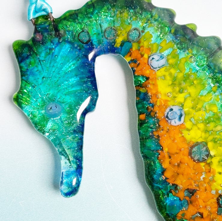 Made by carefully placing different coloured small glass pieces into a seahorse shaped ceramic mould.