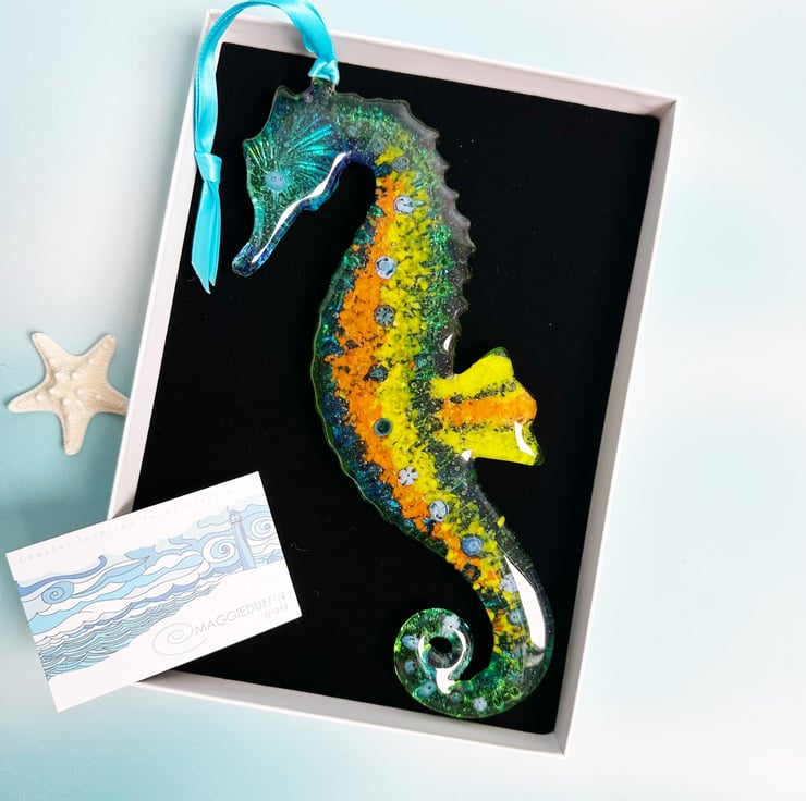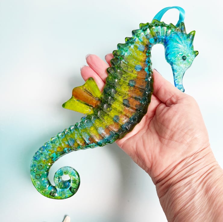 A beautiful and colourful abstract version of the seahorse, with a turquoise satin ribbon. Hang it in your bathroom, sun room, wall or window, suitable really for anywhere you might want a splash of colour.