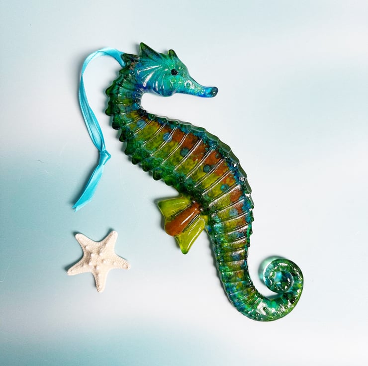 Fired in the kiln to a high temperature, the finished seahorse is shiny and smooth on one side, textured and patterned on the other. You choose which side you would like to display, either way is unique.