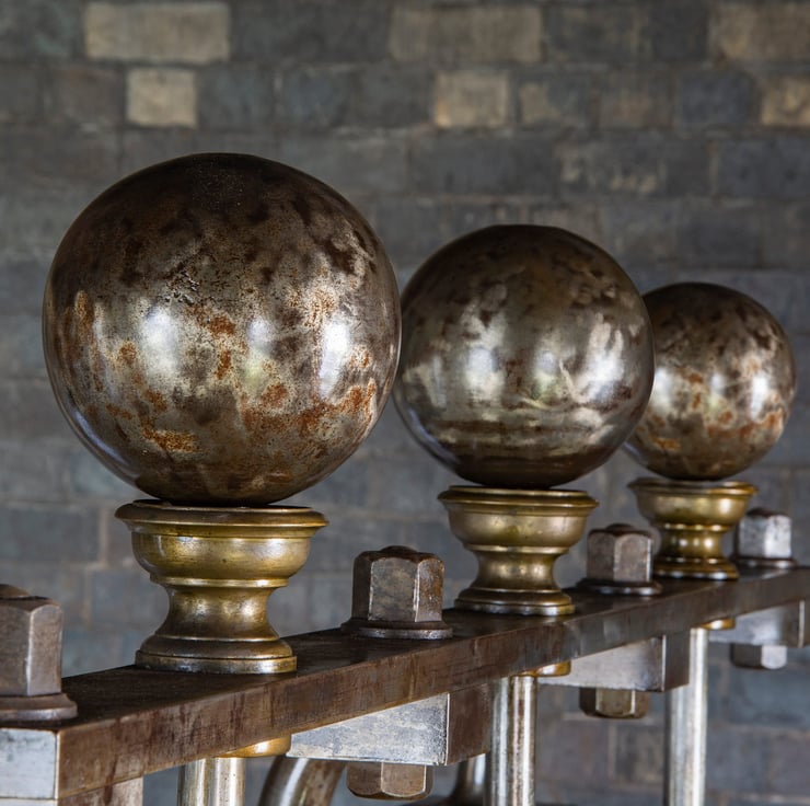 These large metal balls are part of the valve system on a large steam engine, their job was to make sure the valves closed when a camshaft far beneath this level reached the correct part of its cycle.