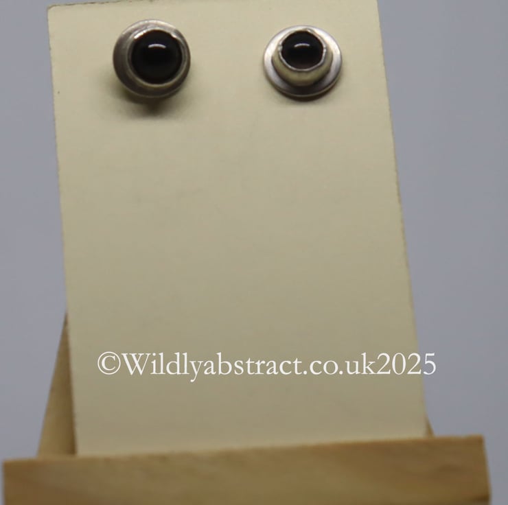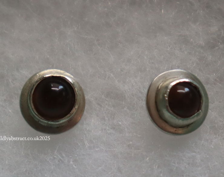 These earrings have handcrafted by myself using traditional silver jewellery making techniques. The earrings are made from sterling silver sheet. Recycled smoky quartz round cabuchons have been set in the silver. The earrings have post and scroll findings. They measure 1cms x 1cms.
