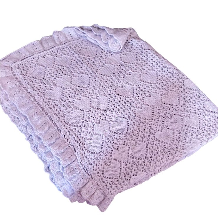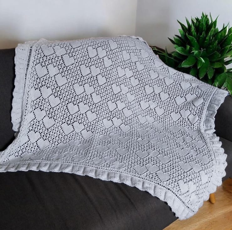 Wrap your little one in love with this hand-knitted baby shawl in soft neutral grey . Lightweight yet cosy, it’s decorated with a delicate lace heart pattern and finished with a sweet ruffled edge – perfect for snuggles, special occasions, or as a keepsake gift.