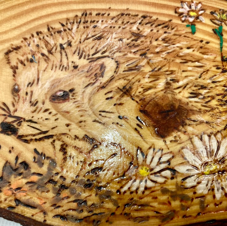 Hand burnt into natural wood with a Pyrography tool ,a hedgehog with spot colour for effect and finished with gloss varnish.