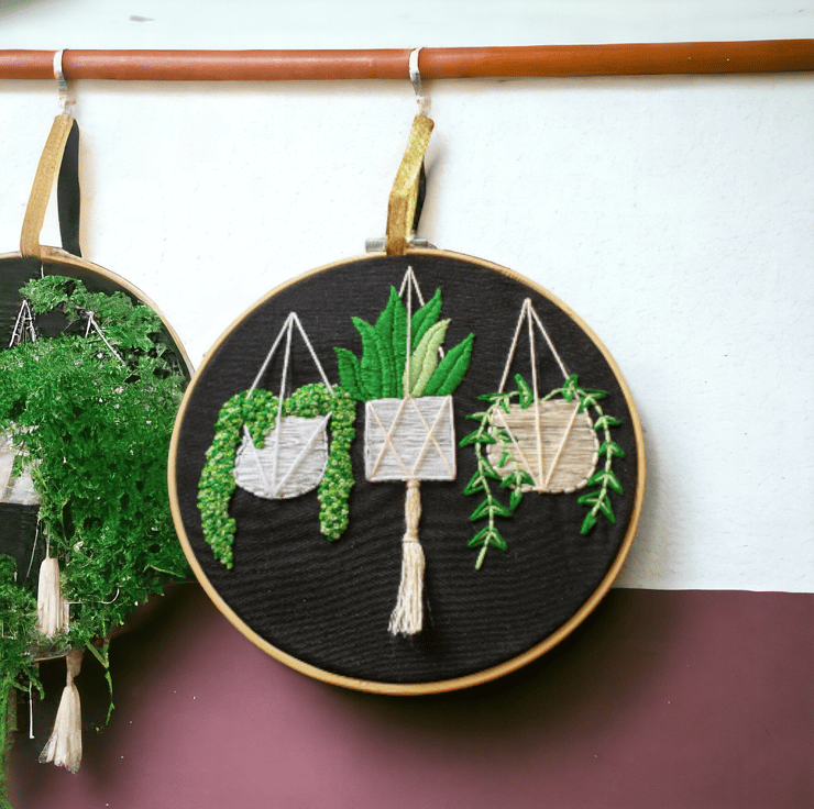 This is a beautiful hand embroidered plant picture framed with a gold ribbon and backed with green velvet material size of hoop is a diameter of 20cm