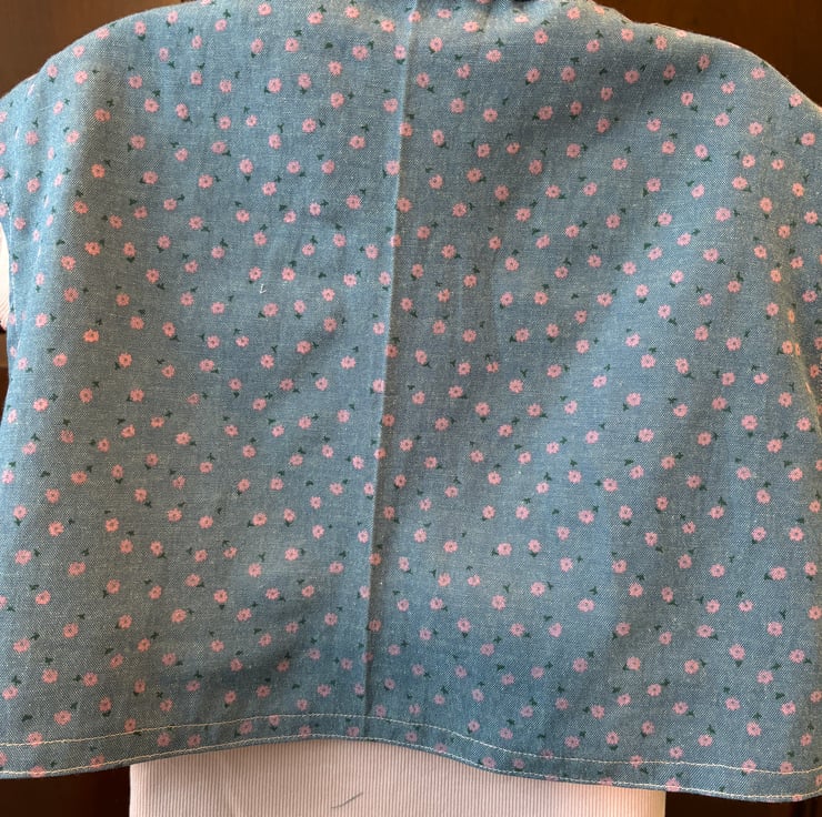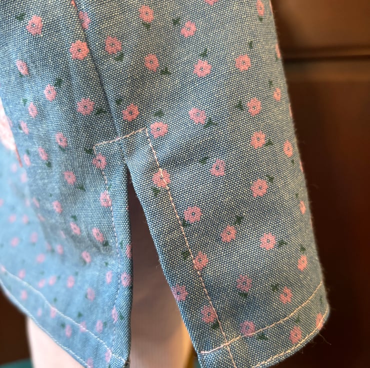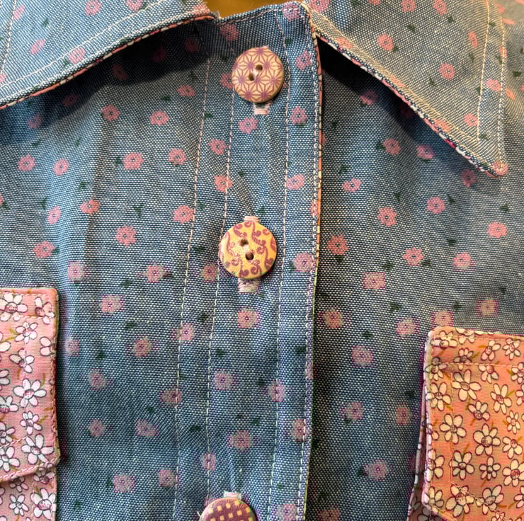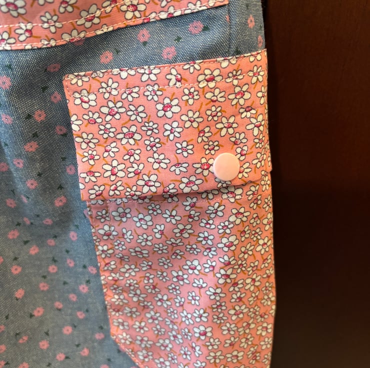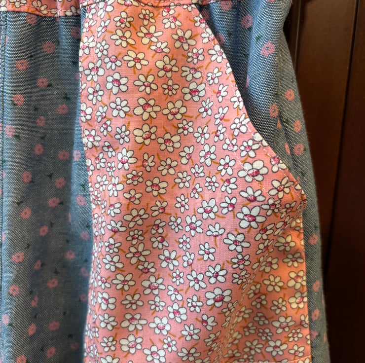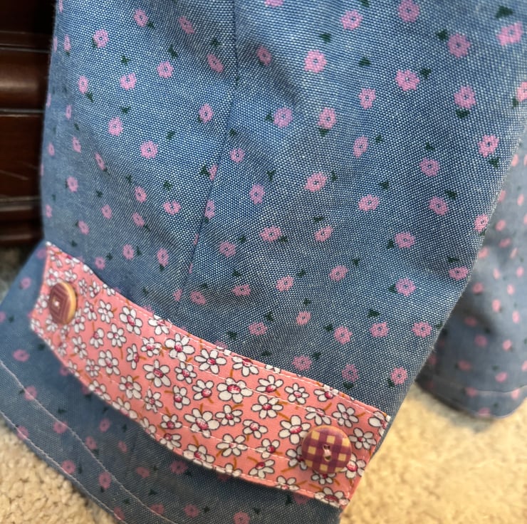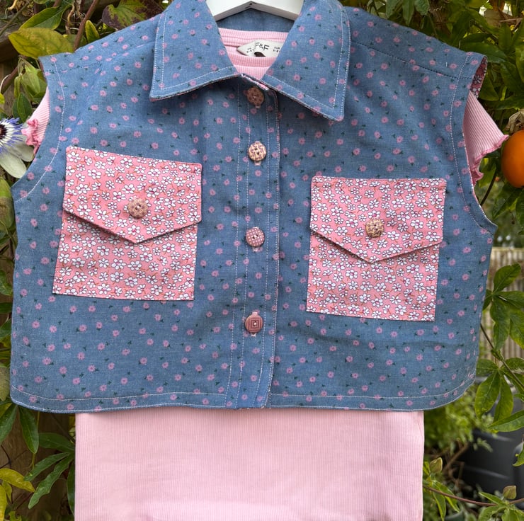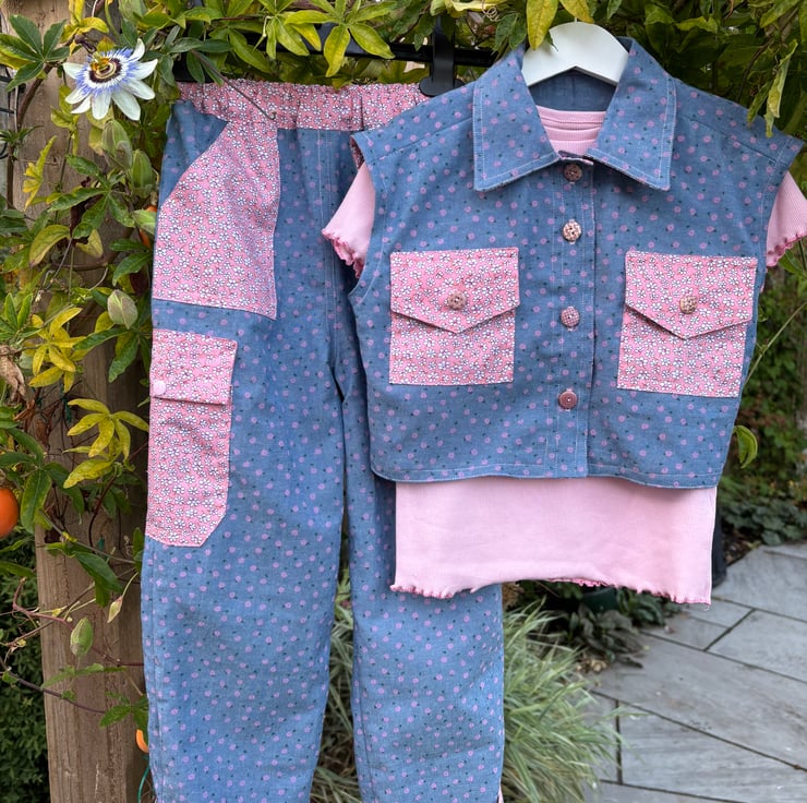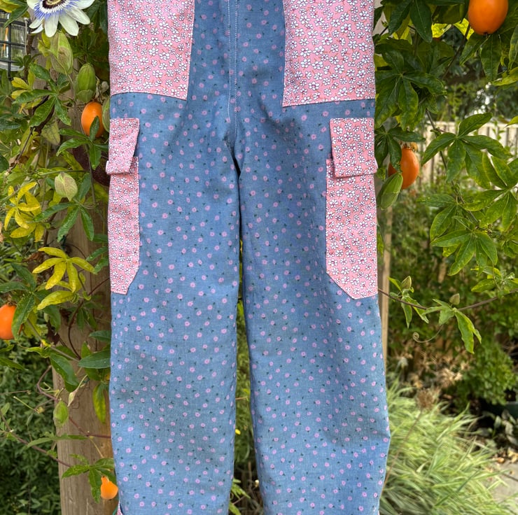 The fabrics is soft printed denim with facings and pockets in a pretty pink floral print.