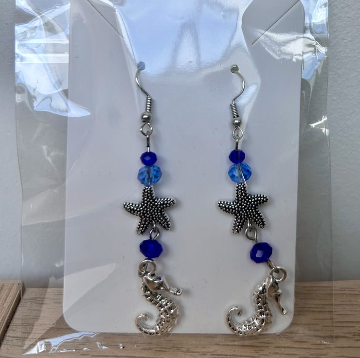 Pale and dark blue acrylic beads, mixed with stainless steel findings for a perfectly beachy look.