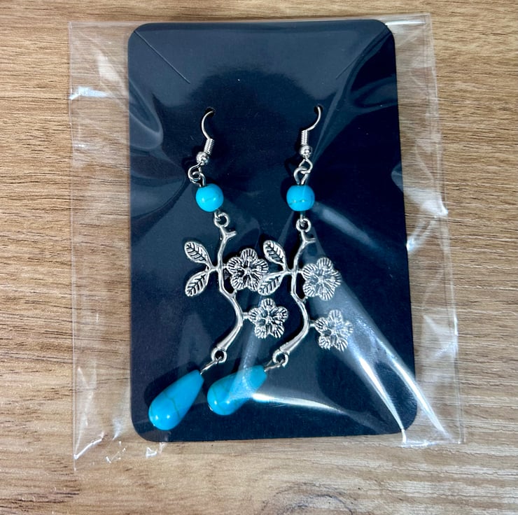 A beautiful mix of stainless steel findings and flowers with synthetic turquoise beads.