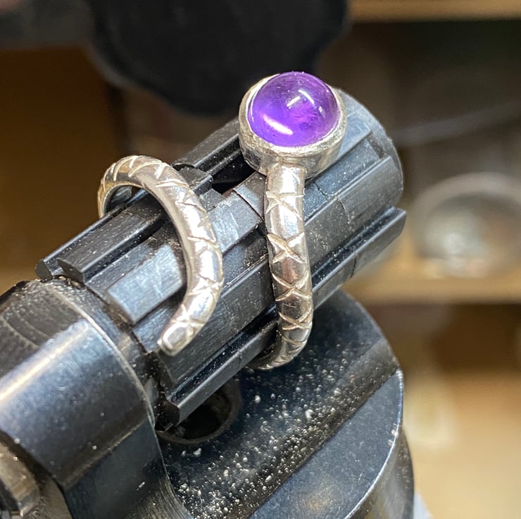 A lovely bright amethyst set in an open design snake ring, it can be sized up or down about a half a size either way. The snake band has been hand carved and patinated. Sterling silver gifts.