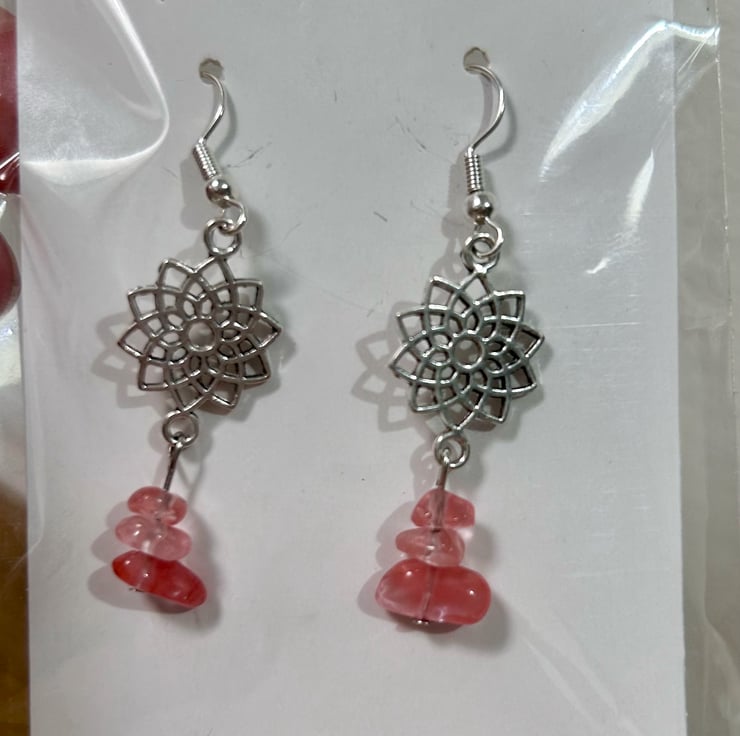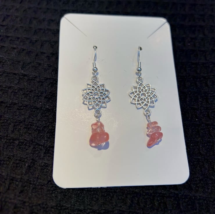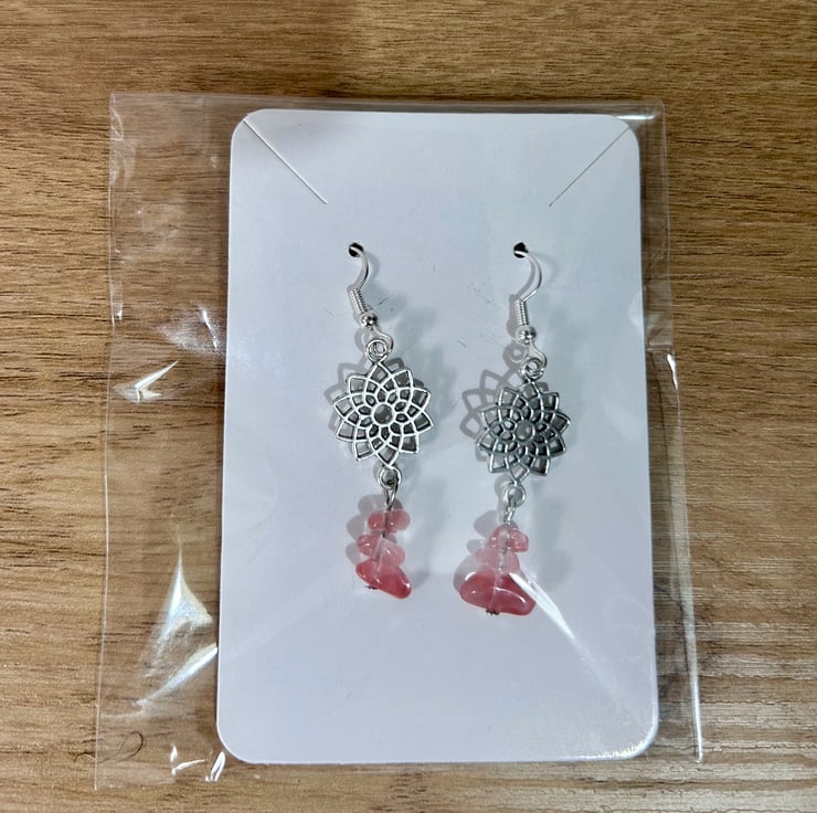 Stainless steel mandala flower, accentuated with peach aventurine, recommended to help with anxiety, worry, stress and shyness.