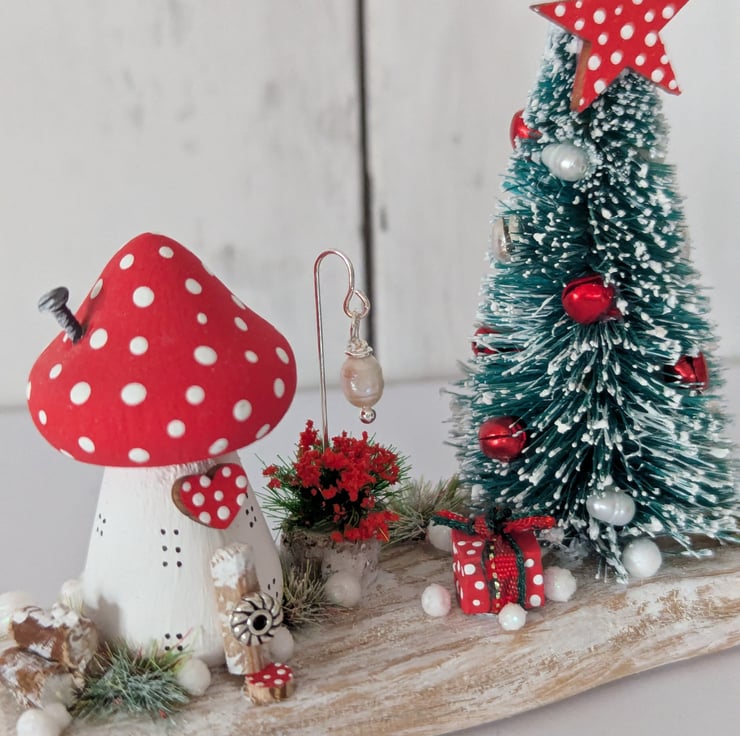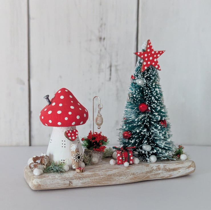 The cosy looking toadstool cottage has a wreath on the door, frosted grass, snowballs and snowy Christmas tree with baubles topped with a polka dot star and gift underneath.