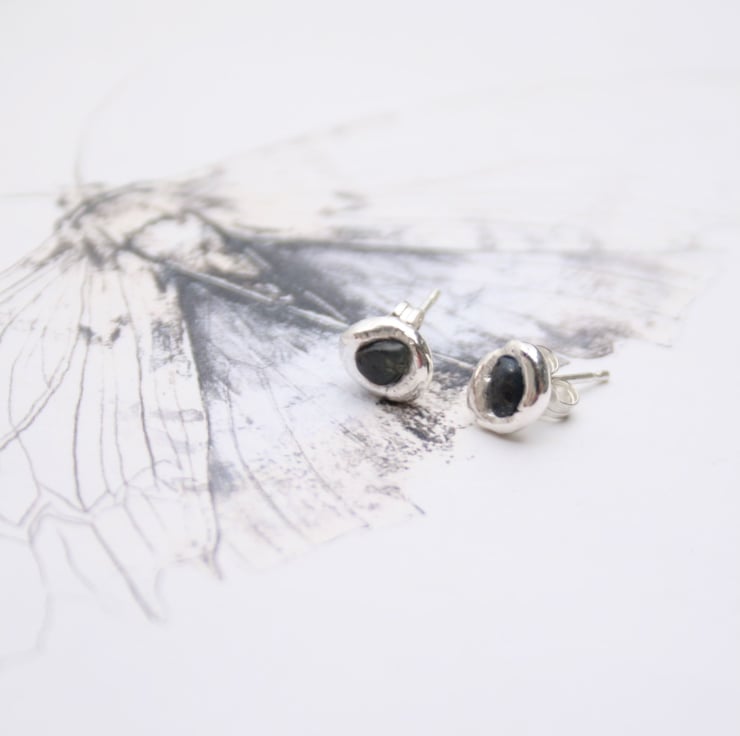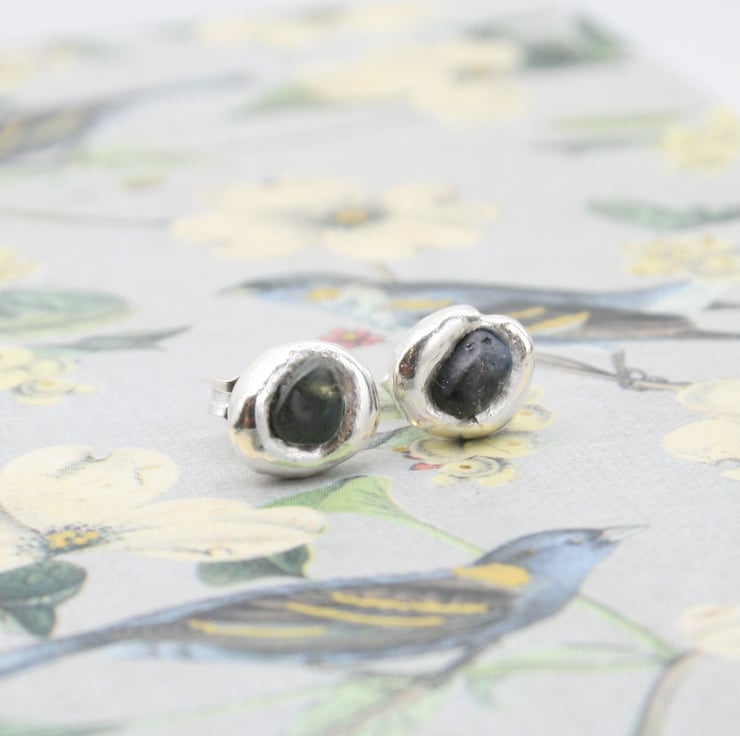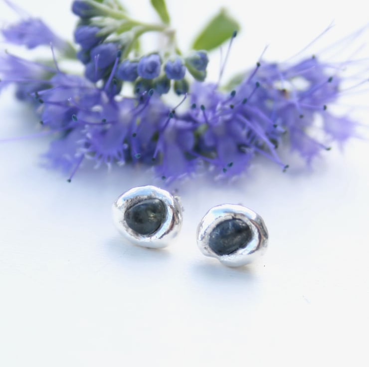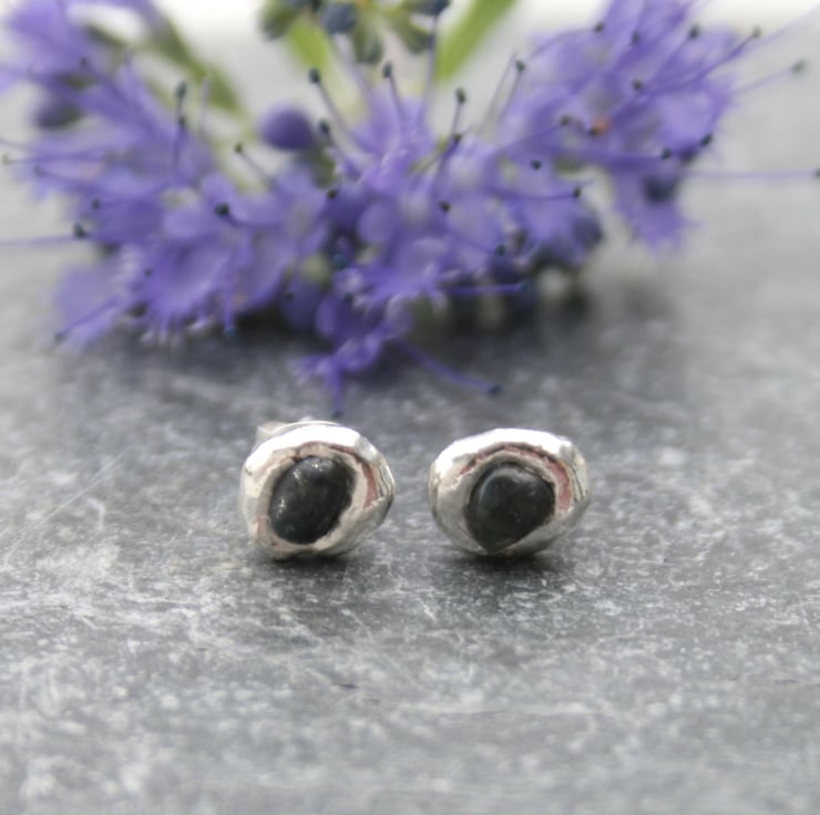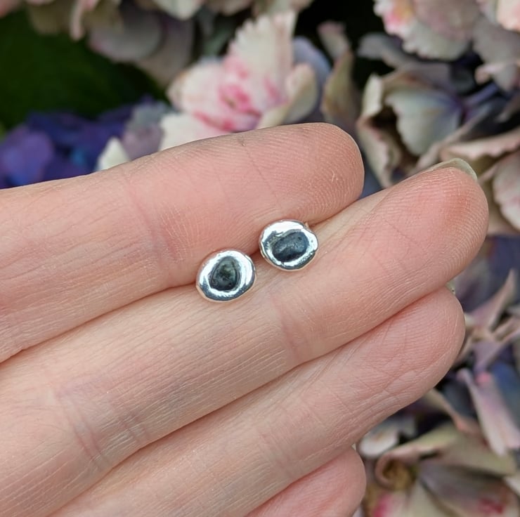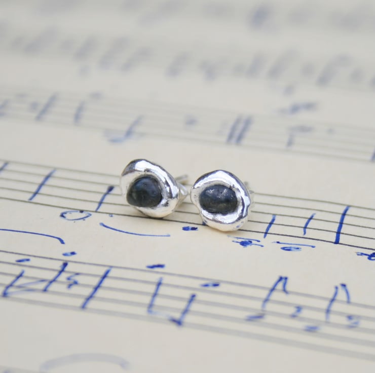 No two pairs will ever be identical. Each sapphire has its own unique shape and the molten silver always forms differently, which makes every pair truly one of a kind. I do, however, carefully match them in size so they sit beautifully as a pair. The studs are around 6–9 mm in diameter, making them simple, elegant earrings you can wear every day.