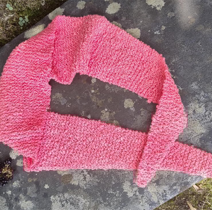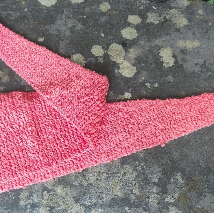 This small scarf, hand knitted in a cotton boucle yarn is soft and lightweight, perfect to fill the gap between collar and cap, to be snuggly warm, without the bulk of a longer scarf. Wrap it once like a small neck shawl, or wrap it twice to keep out he draughts.