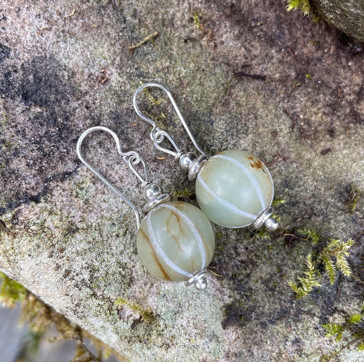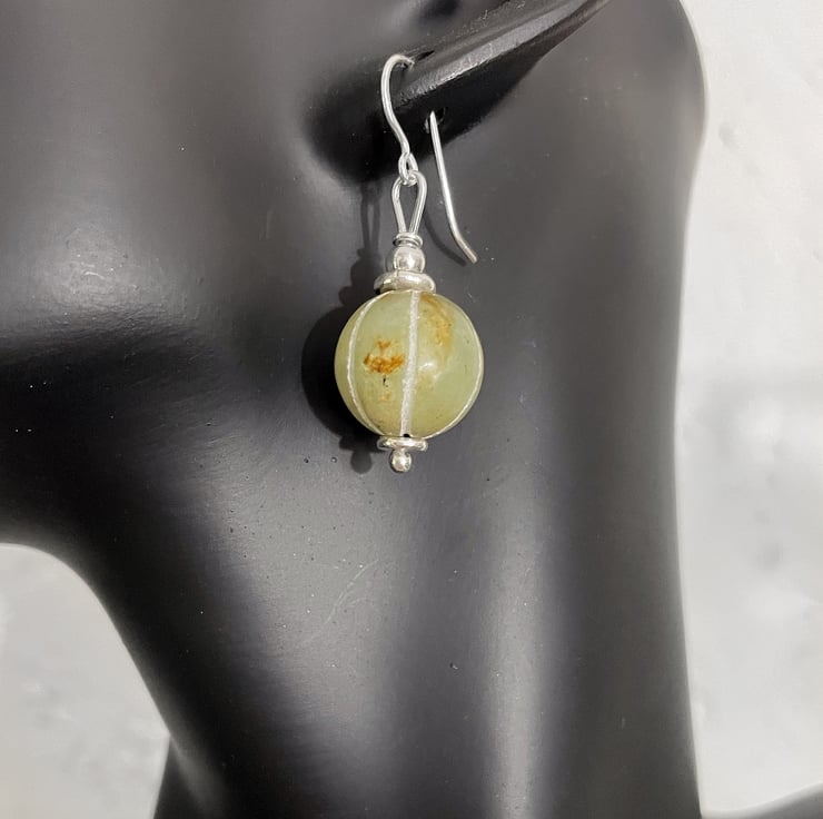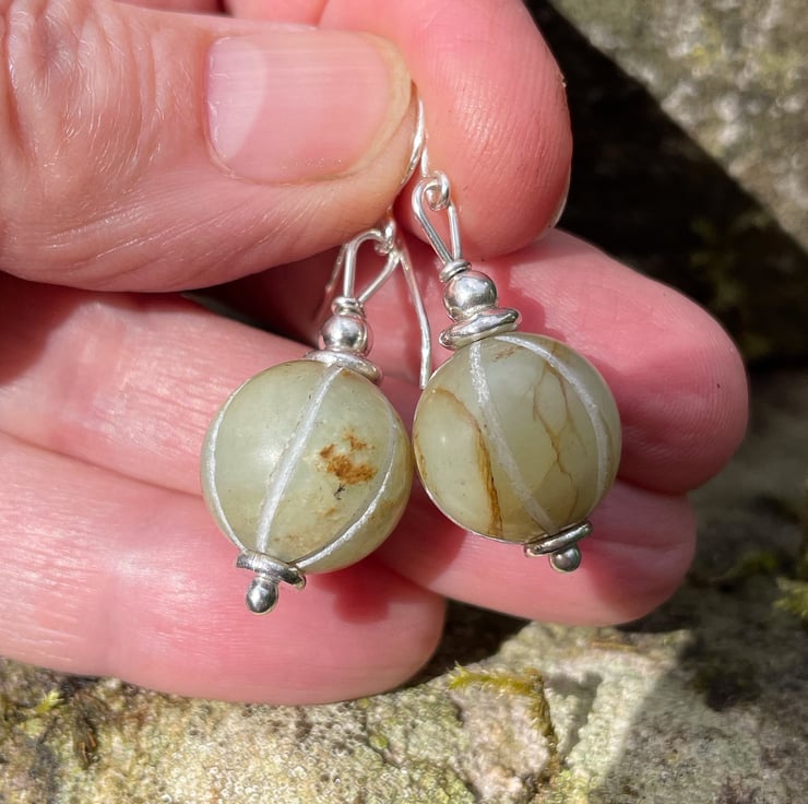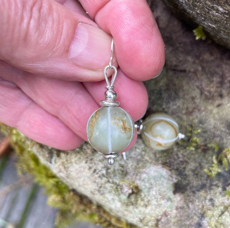Hand carved pale green jade beads have been threaded on handmade silver head pins, with silver beads top and bottom and hung from handmade hooks.