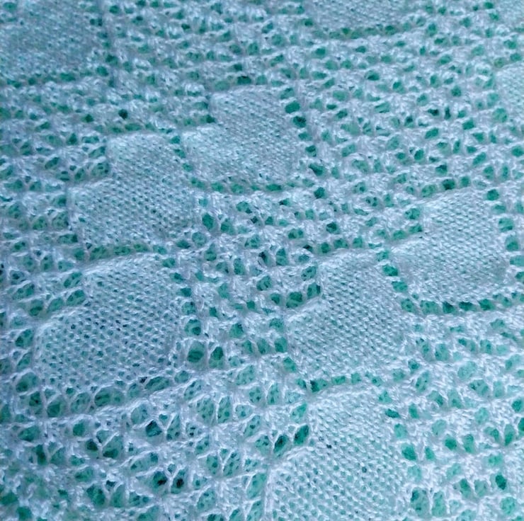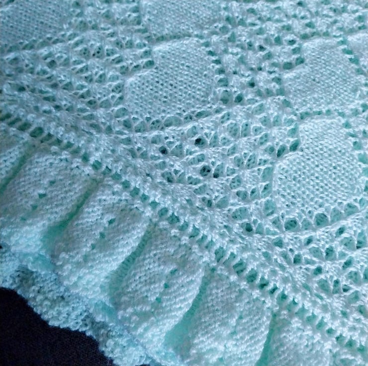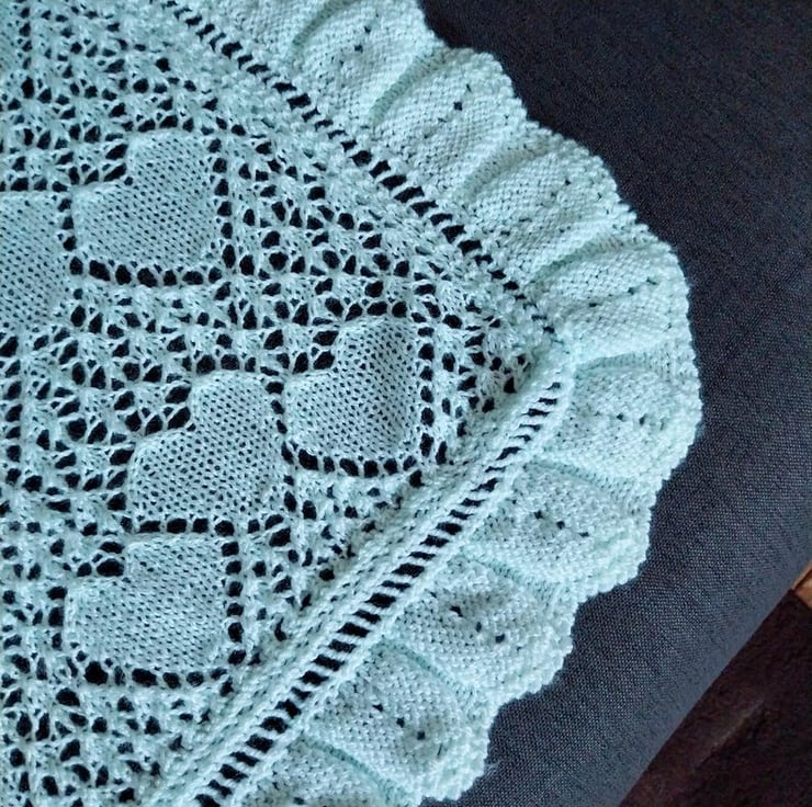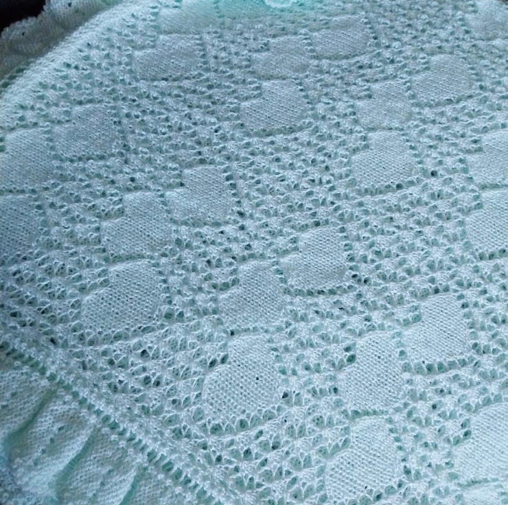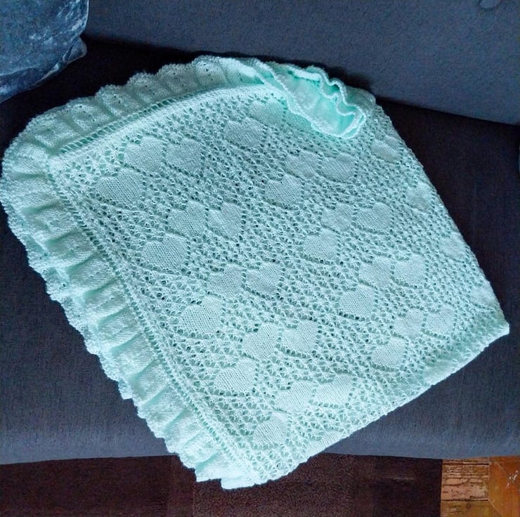 Wrap your little one in handmade comfort with this mint green baby shawl. Beautifully knitted in a delicate heart lace pattern with a ruffled edge, it’s the kind of keepsake blanket that will be treasured for years.