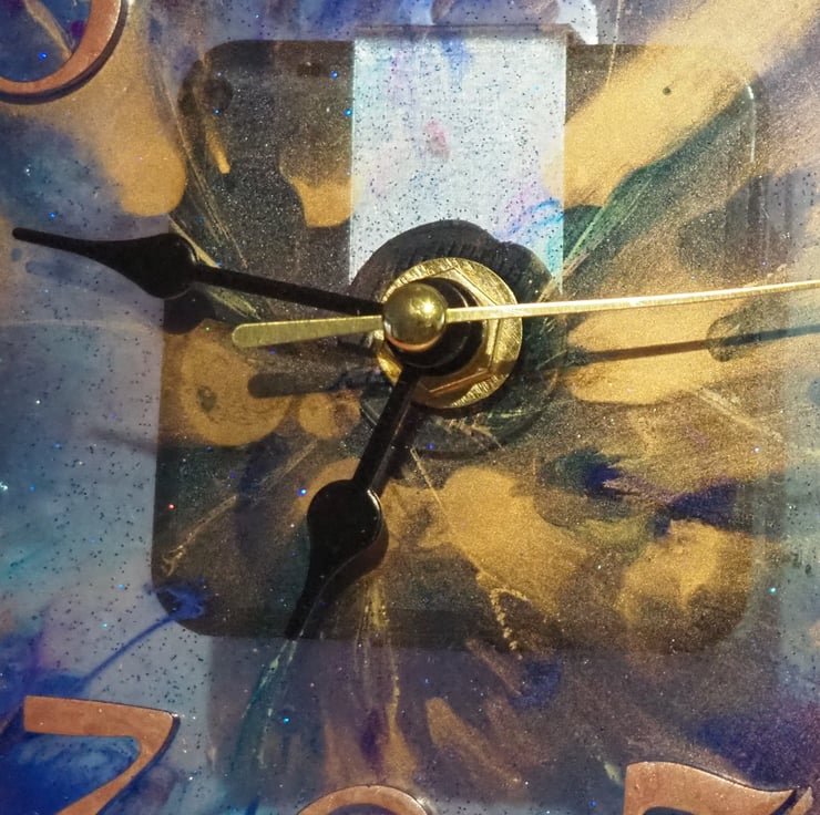 This is a beautiful small clock that would fit well into any room. It measures approximately 15.5cm in diameter and includes a fully functioning mechanism with a battery, three hands and a hanging hook. This clock is in blues and gold with glitter. The numbers are a gold colour and the hands are black and gold. If you would like a specific colour set and cannot find it, please contact me for a custom piece. Matching items can also be made. Please note resin may contain small bubbles and it is not dishwasher safe.