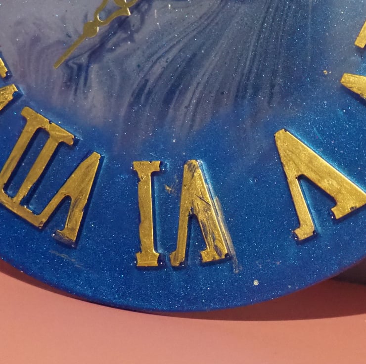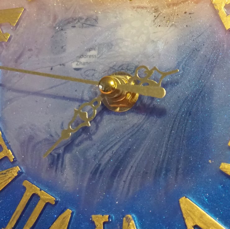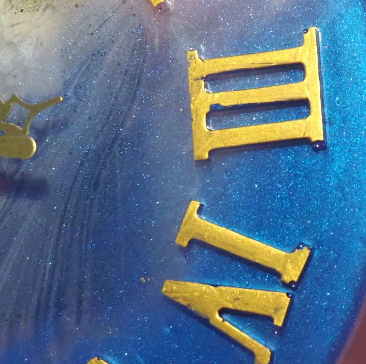 This is a beautiful small clock that would fit well into any room. It measures approximately 15.5cm in diameter and includes a fully functioning mechanism with a battery, three hands and a hanging hook. This clock is in blue, white and yellow with glitter. It is designed to look like a beach scene with sand, surf and sea. The numbers are a roman numerals in a gold colour and the hands are gold. If you would like a specific colour set and cannot find it, please contact me for a custom piece. Matching items can also be made. Please note resin may contain small bubbles and it is not dishwasher safe.