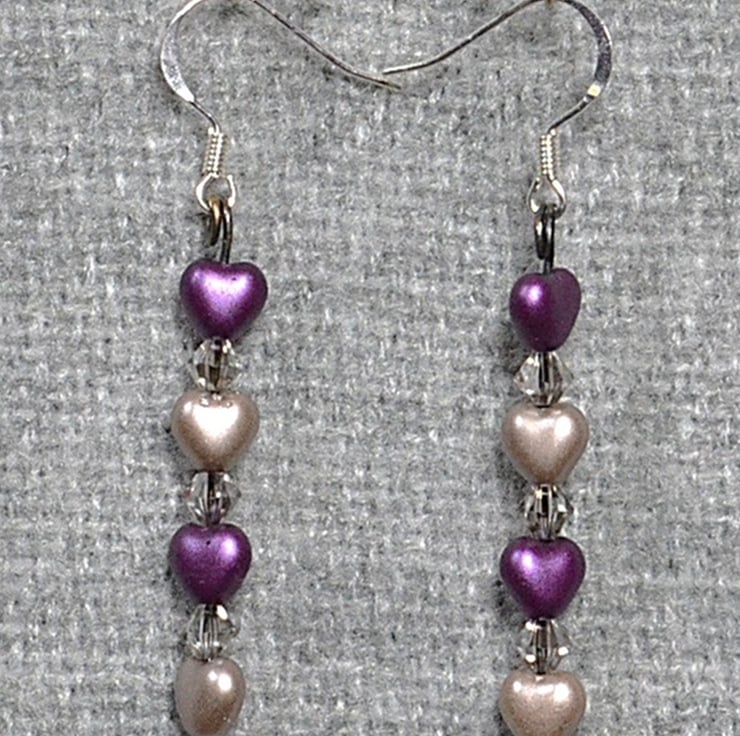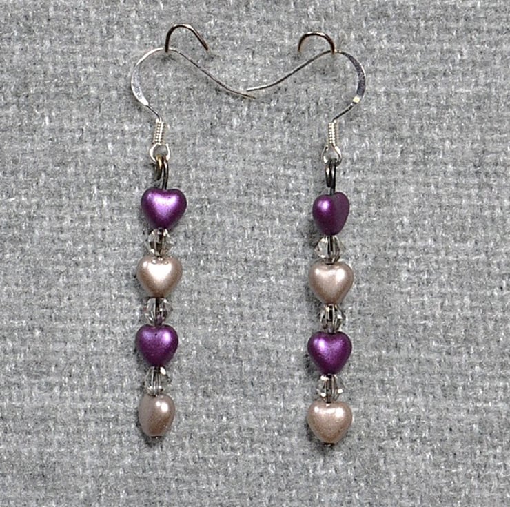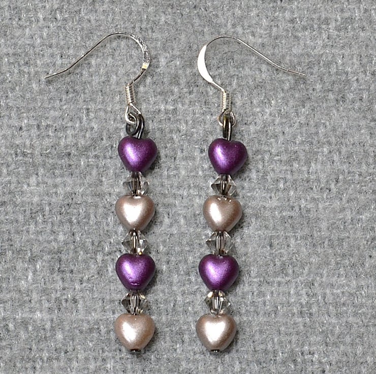 These pretty earrings feature two purple glass heart beads and two soft warm grey heart beads, combined with tiny smoky crystals. The dangle on these earrings measures approximately 4.5cm, or 1 3/4 inches, and is attached to silver-plated ear wires.