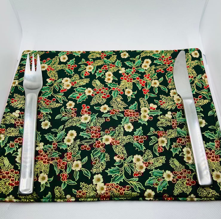 Christmas Table place mats for your Christmas dinner table in a lovely green and red fabric with metallic accents