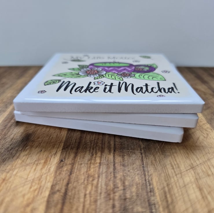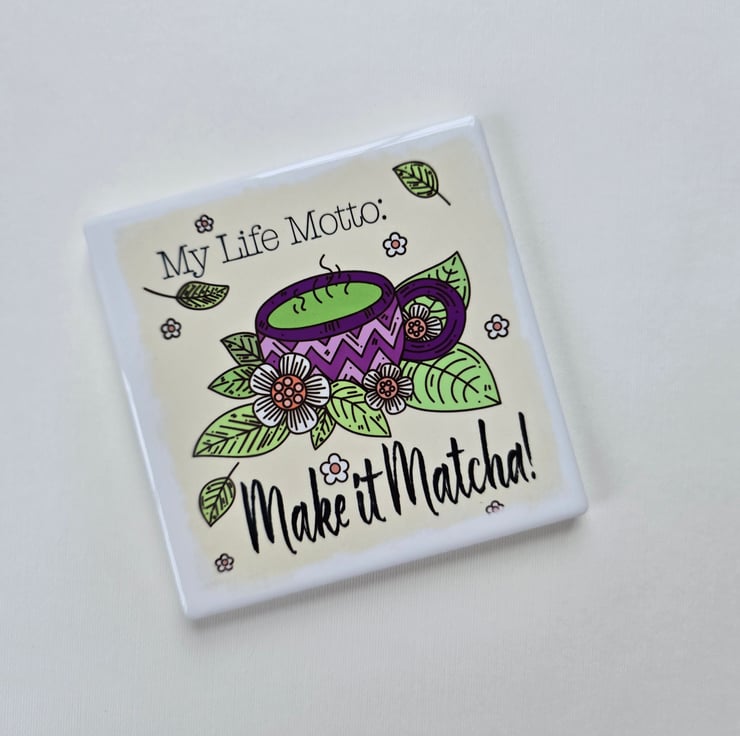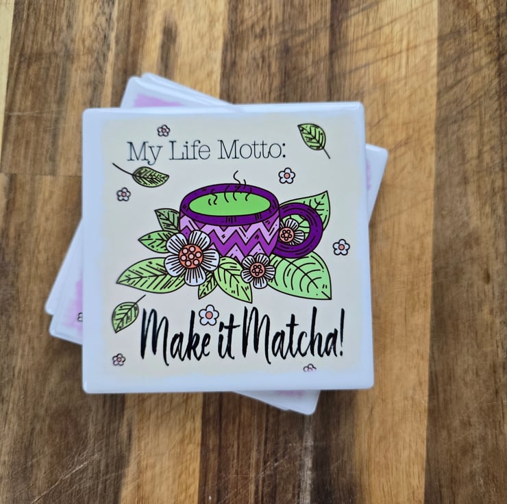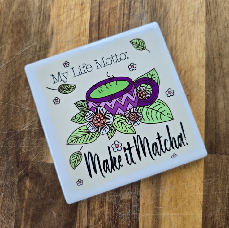 Bring a little calm and colour to your day with this unique ceramic coaster. Featuring the playful and relatable motto, "My Life Motto: Make it matcha!"