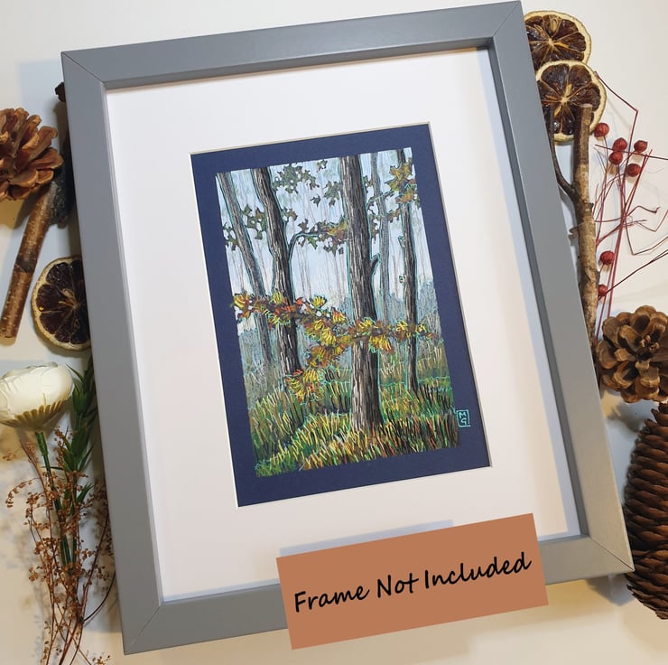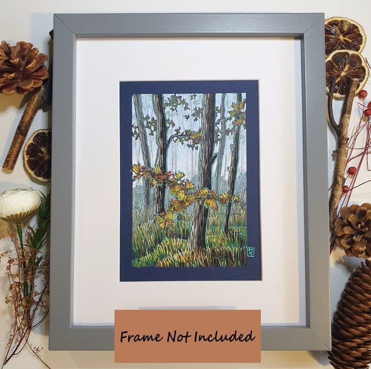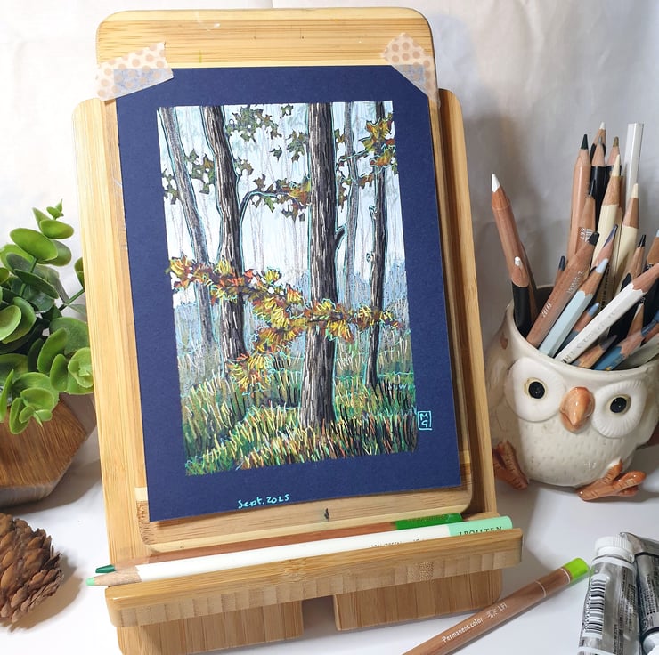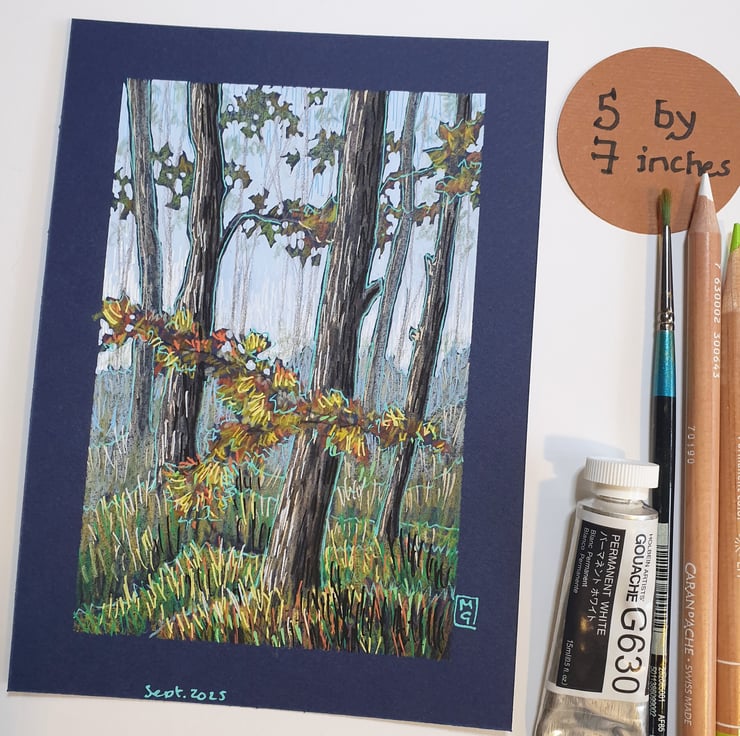 A small colour drawing of tree trunks and branches in a woodland area in autumn with golden autumn tones and a blue background. The drawing is on dark blue pastel paper.