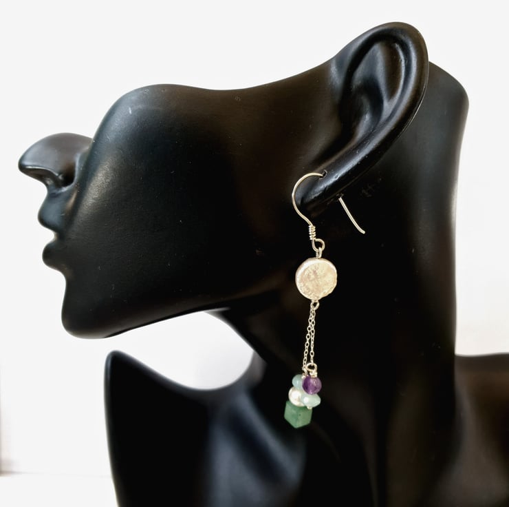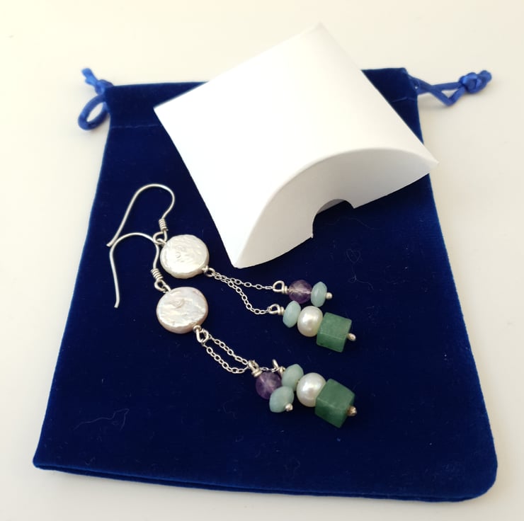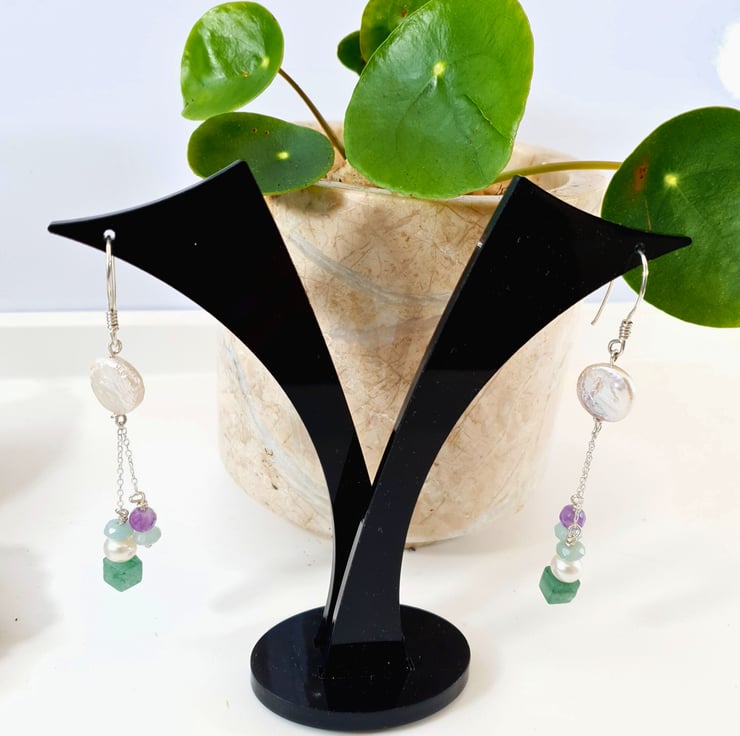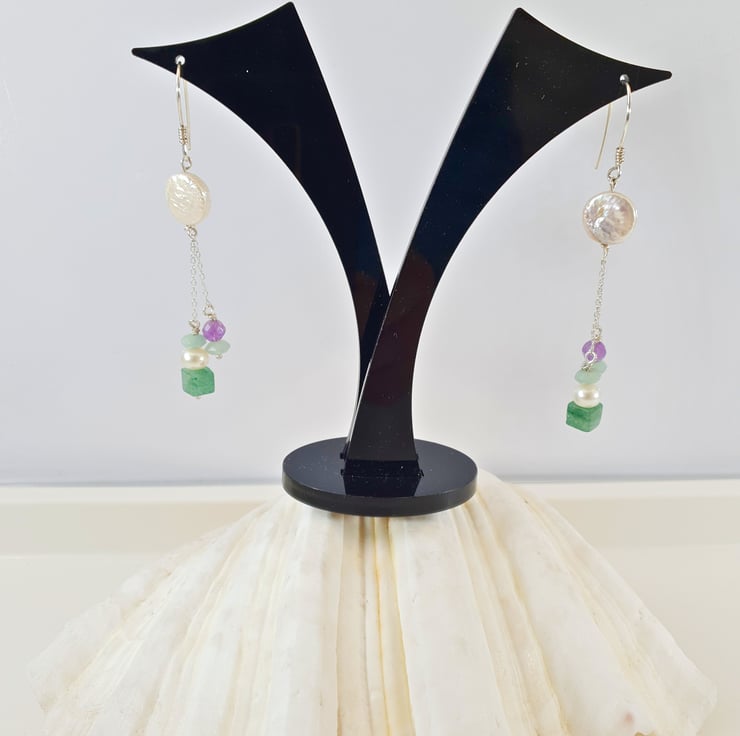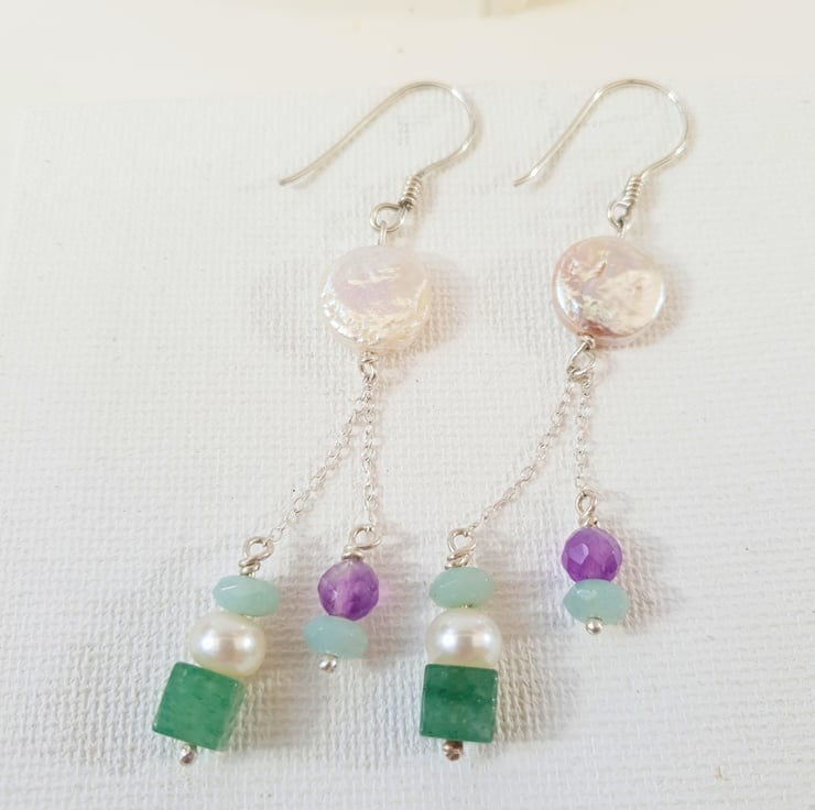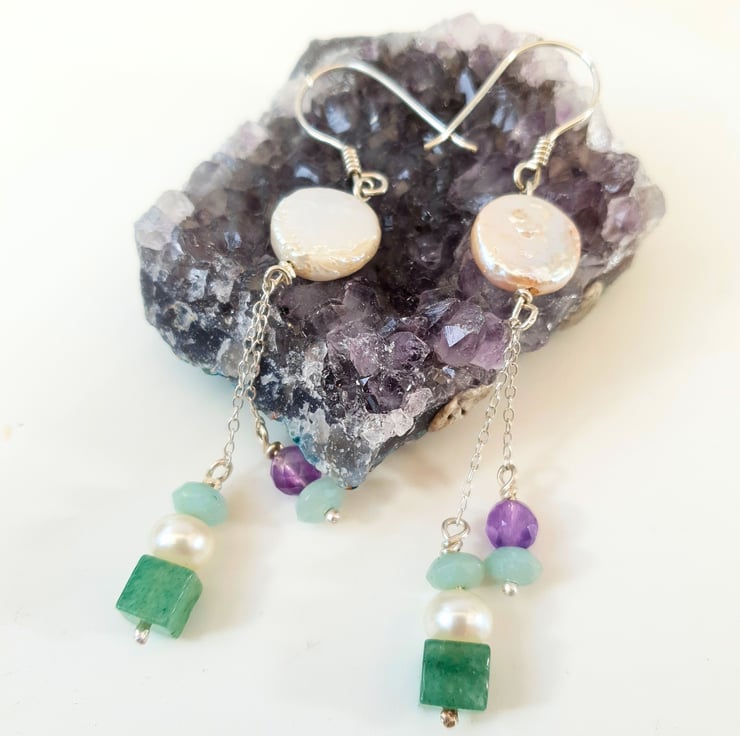 Statement Long Earrings Coin Pearl & Gemstone Drops Amethyst, Jadeite, Amazonite