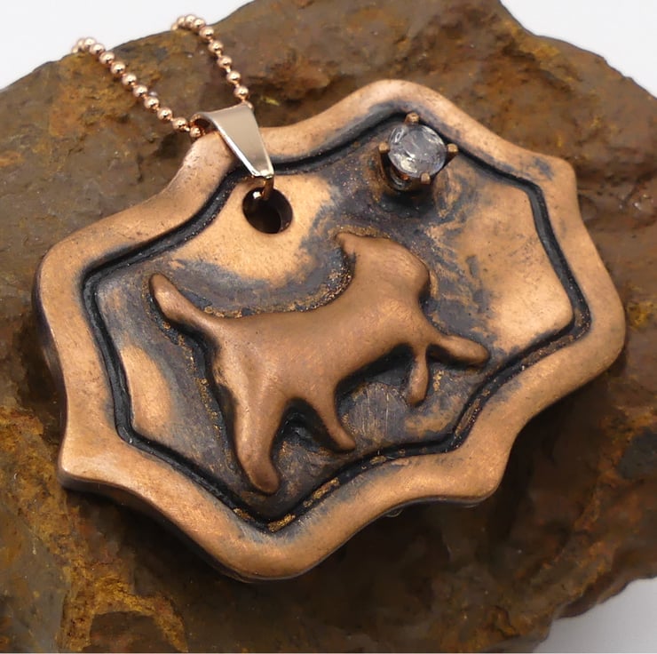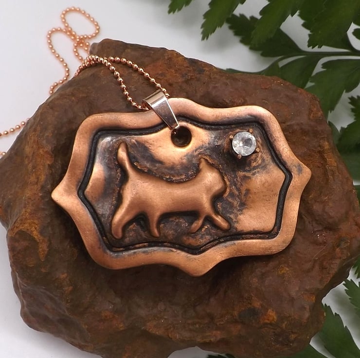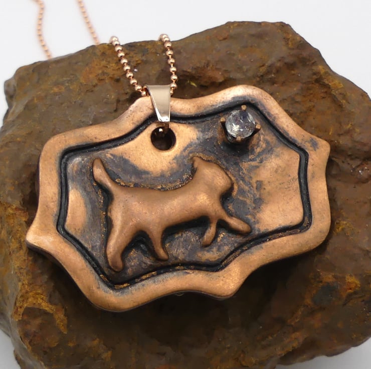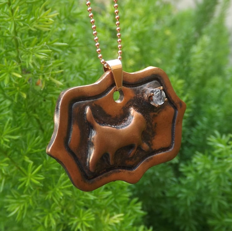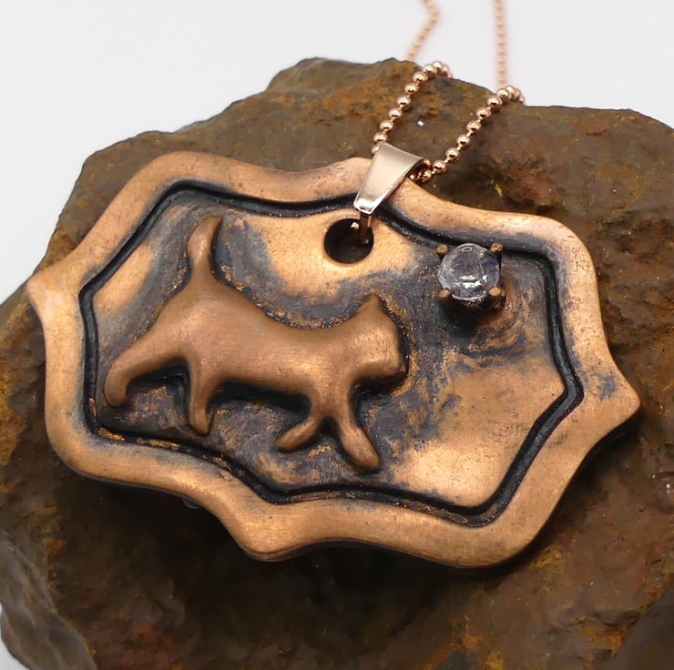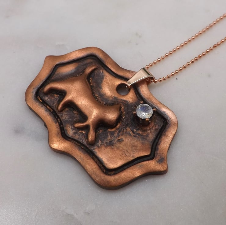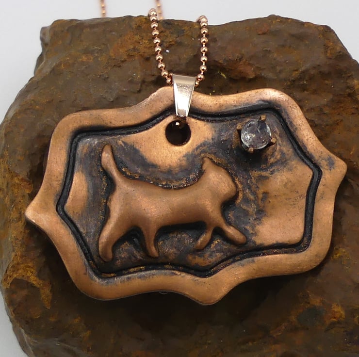 Recycled Copper Cat on Picture Frame Pendant with Rainbow Moonstone Necklace.