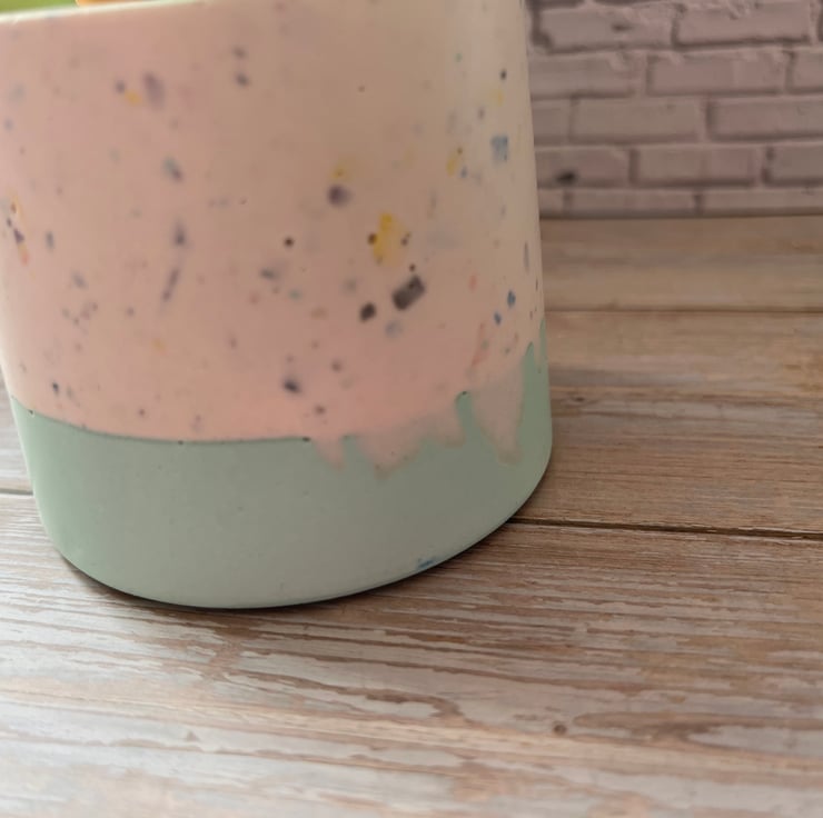 A celebration of summer in miniature form. This handcrafted pot stands just under 3 inches tall, with a 3-inch base that feels perfectly balanced in the palm. The lower half glows in a refreshing peppermint hue—cool, crisp, and reminiscent of garden mint on a sunny day. Above, a soft white top is playfully speckled with terrazzo fragments in cheerful colours, evoking the joyful scatter of confetti at a celebration.