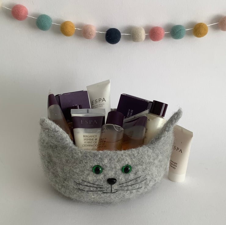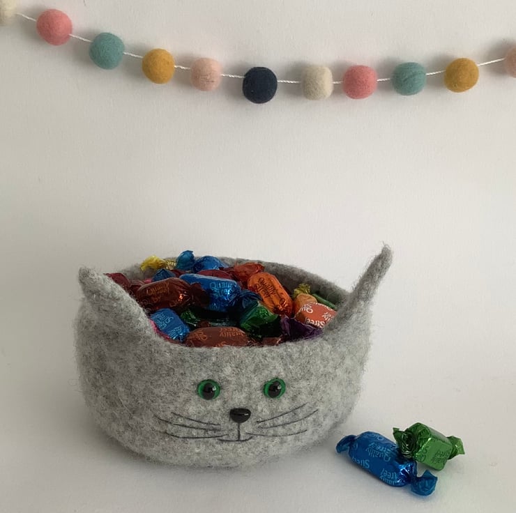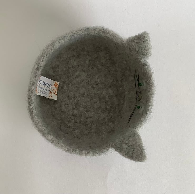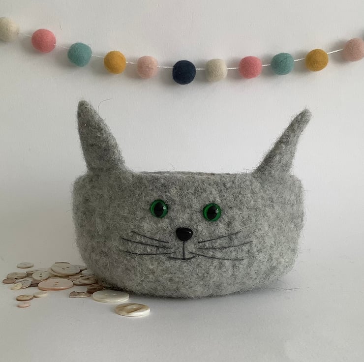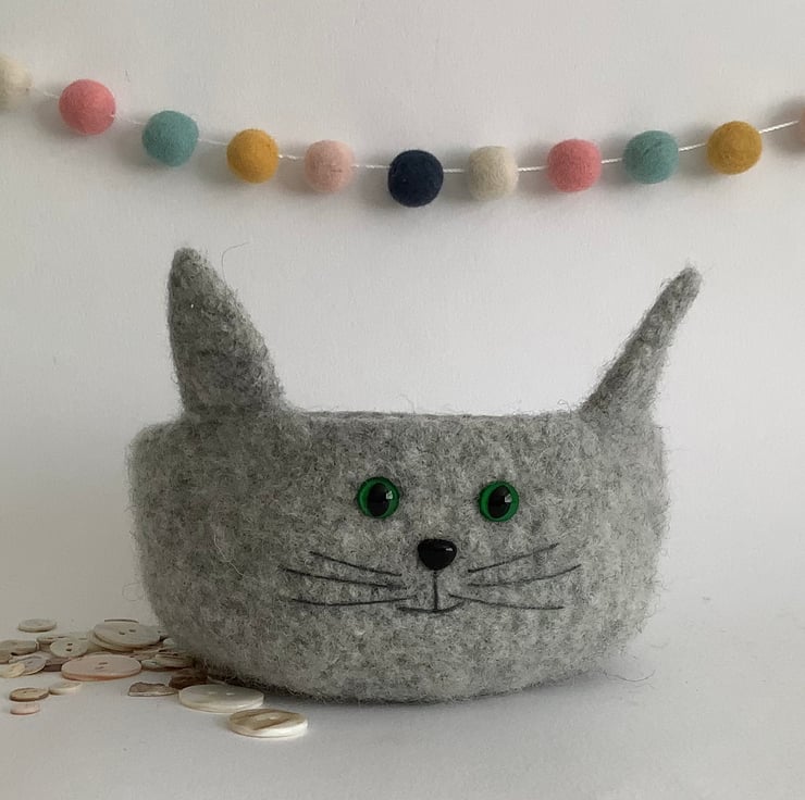 I have designed and made his perfectly useful , fun , OOAK , 'Fusspot' bowl / desk tidy using 100% pure wool . What a sweet feline ! perfect for the kitty lover!