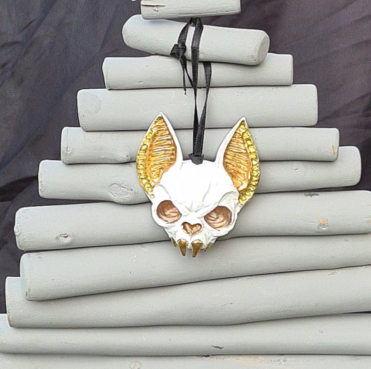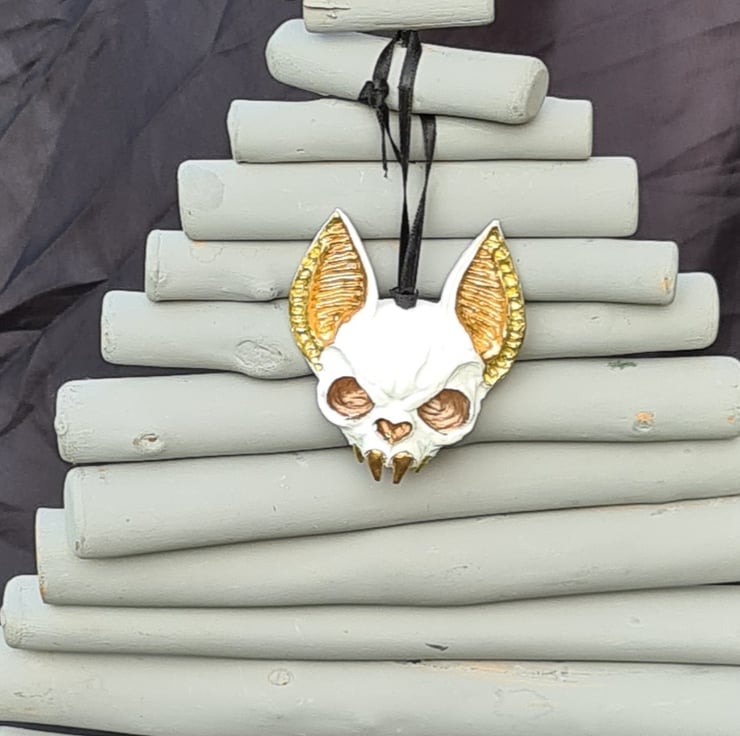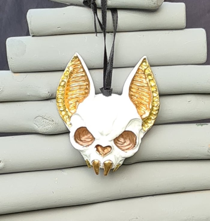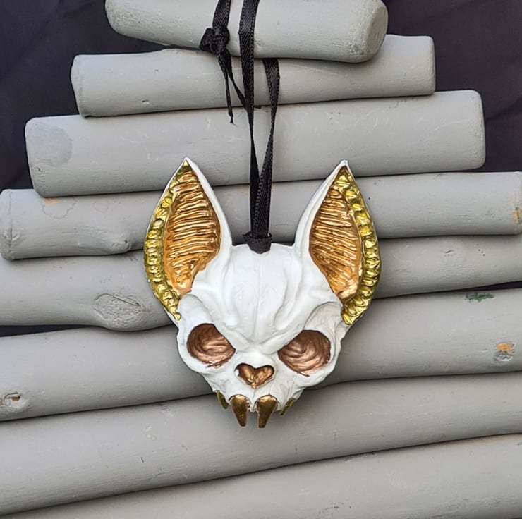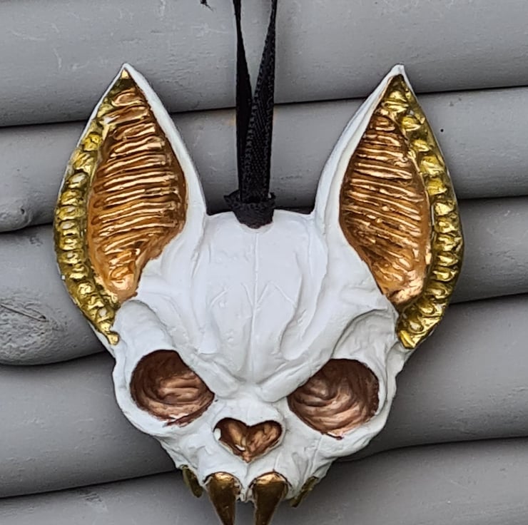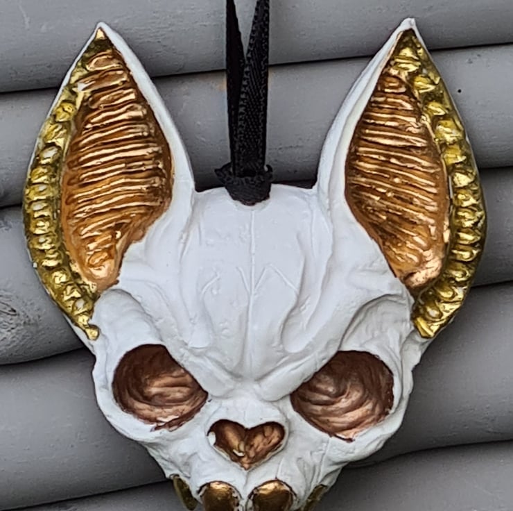 Spooky Metallic tone & White Bat Skull ornament. Made from Resincrete and painted with Gold, Copper and Bronze metallic details and hung on a Black ribbon.