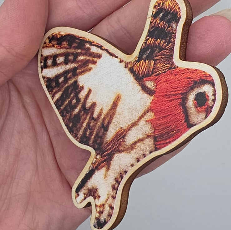 The design is based on my hand-embroidered Barn Owl, originally stitched onto soft off-white felt. It’s then professionally reproduced onto sustainably sourced Birch-faced Poplar wood using ultra low VOC UV inks – keeping the detail, texture, and charm of the original piece alive in a durable, eco-friendly form.