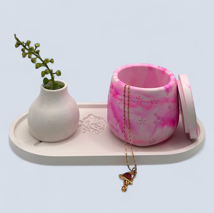 The jewellery box is handmade from a natural water based mineral material with a hard stone like finish. Each piece is made in my home studio and the marbling pattern varies on every pot, making each one unique. Subtle colour variations or small air bubbles may appear and reflect the handmade process. The exterior is polished with a plant based wax sealer for a soft satin sheen. The interior is left unsealed with its smooth natural texture.