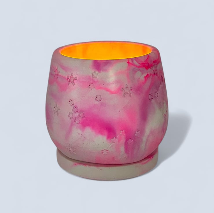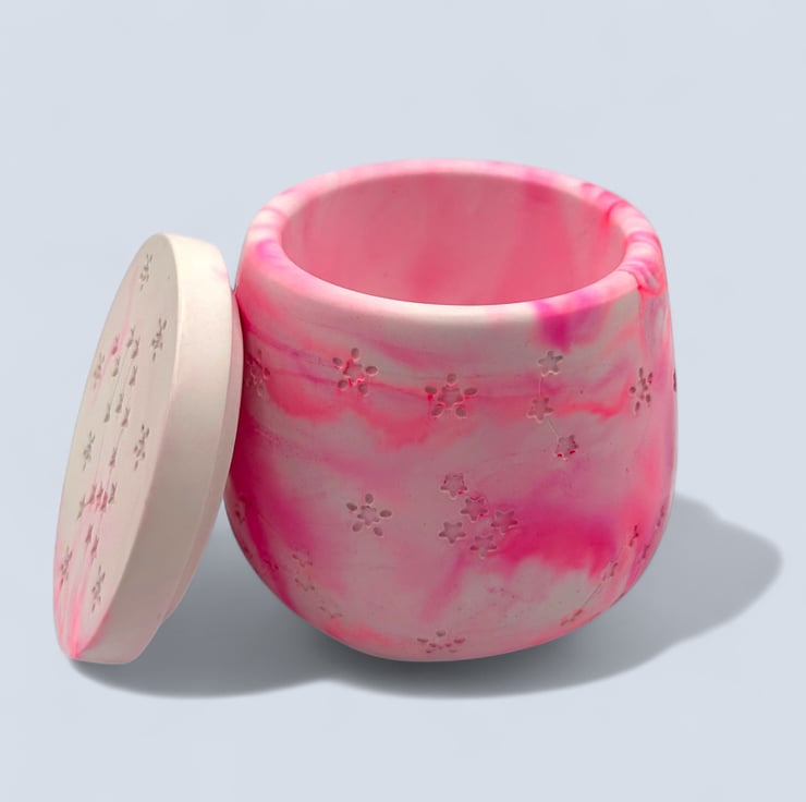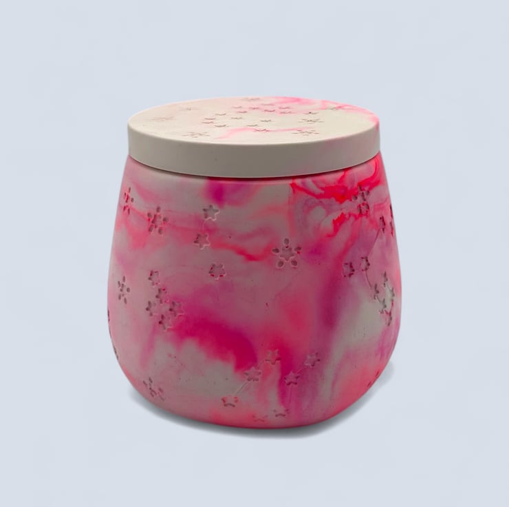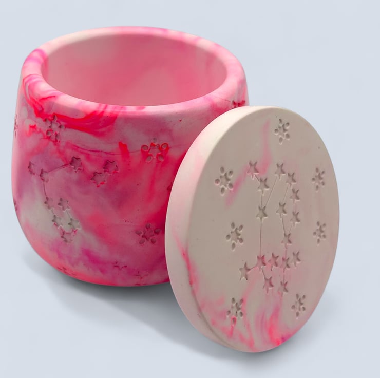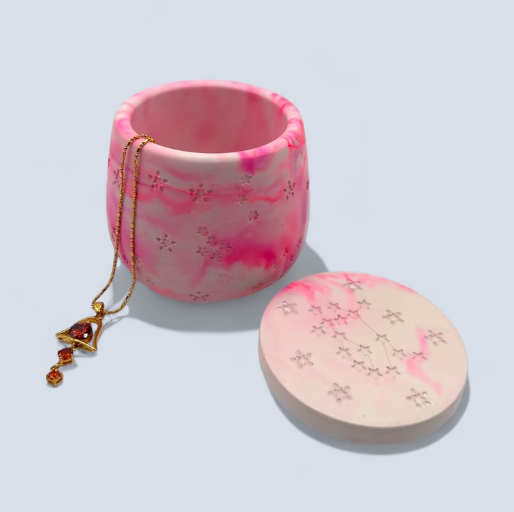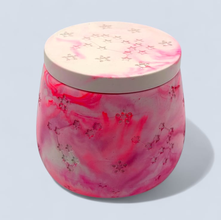Pink marbled jewellery box with star and constellation details. This handmade jewellery box has a flowing pink marbled pattern across the exterior, with tiny star and constellation details that add a soft celestial touch. It is ideal for storing rings, earrings, keepsakes or small treasures and makes a lovely gift for anyone who enjoys colourful handmade decor. The pot can also be used as a candle jar to hold tealights or small pillar candles, and when used this way the matching lid can be repurposed as a small coaster to protect your surfaces from heat.