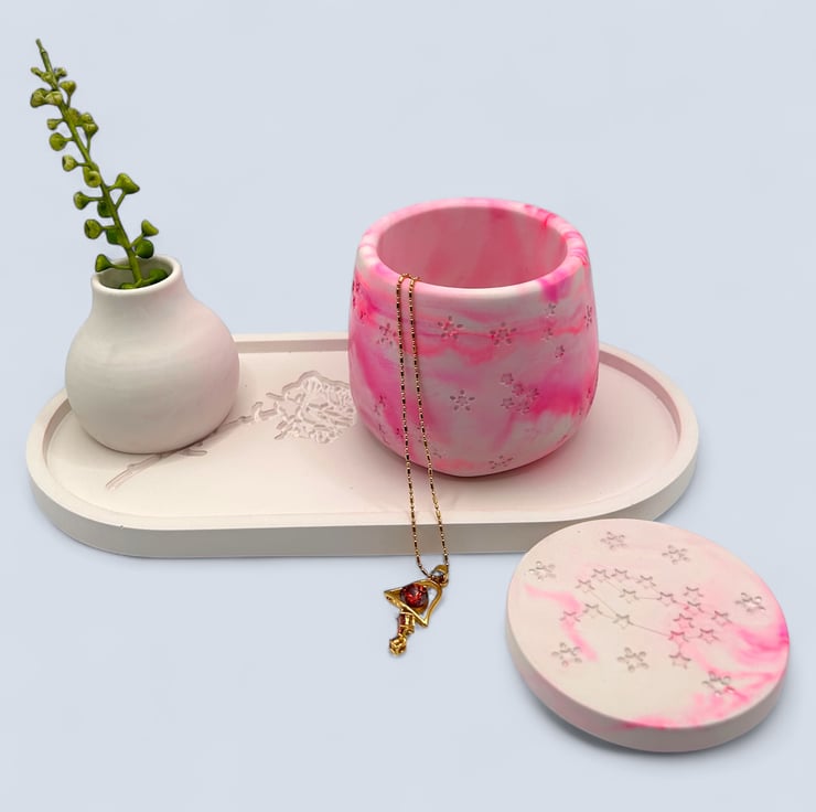 The bold pink marbling on this jewellery box feels full of movement, almost like colour swirling through water. The tiny star and constellation details sit across the surface like scattered light, giving it a fun mix of energy and softness. Every piece settles differently as it is made, so each one has its own lively pattern and personality.