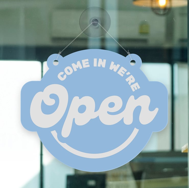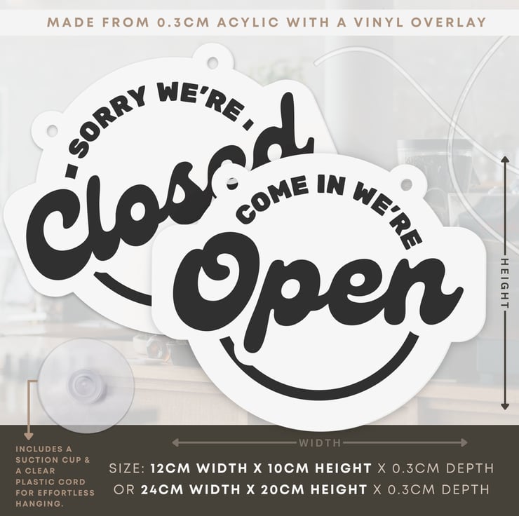 Each sign includes both Open and Closed sides — simply flip it over to update your shop status in seconds. Choose from a wide range of acrylic base and vinyl colours to perfectly match your brand aesthetic. Comes complete with a clear hanging cord and suction cup for easy display on glass doors or windows.