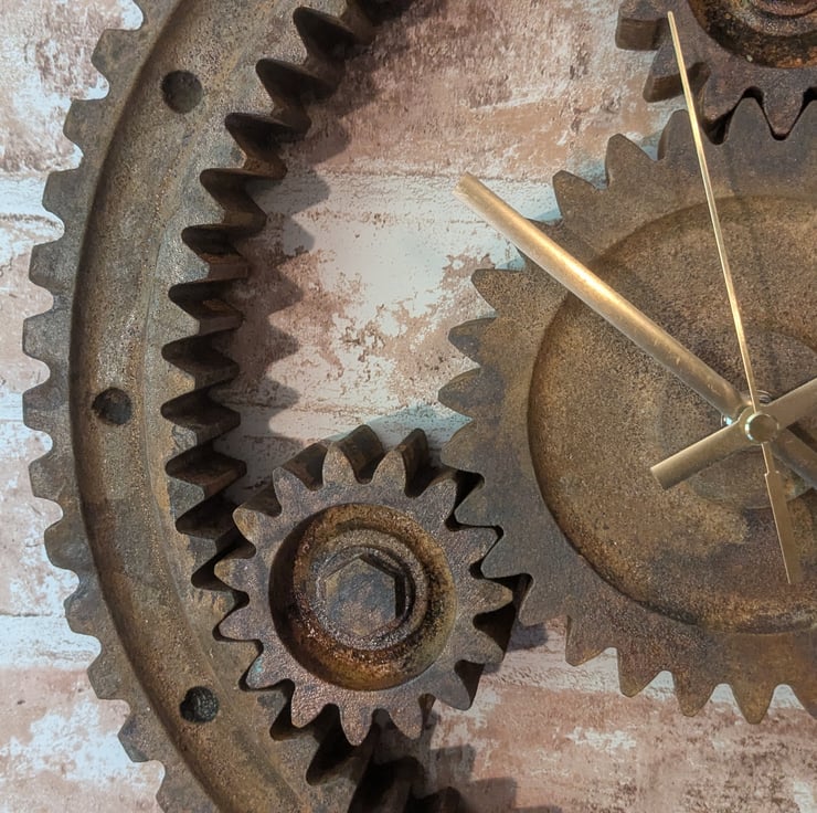This amazing gear inspired clock is just under 400mm in diameter and around 35mm thick and comprised a central gear housing the quartz clock mechanism, this is surrounded by three smaller cogs and a larger outer ring cog. These are all free to move by hand so you can adjust the look of the clock. (I make a 600mm version so please message me if interested)