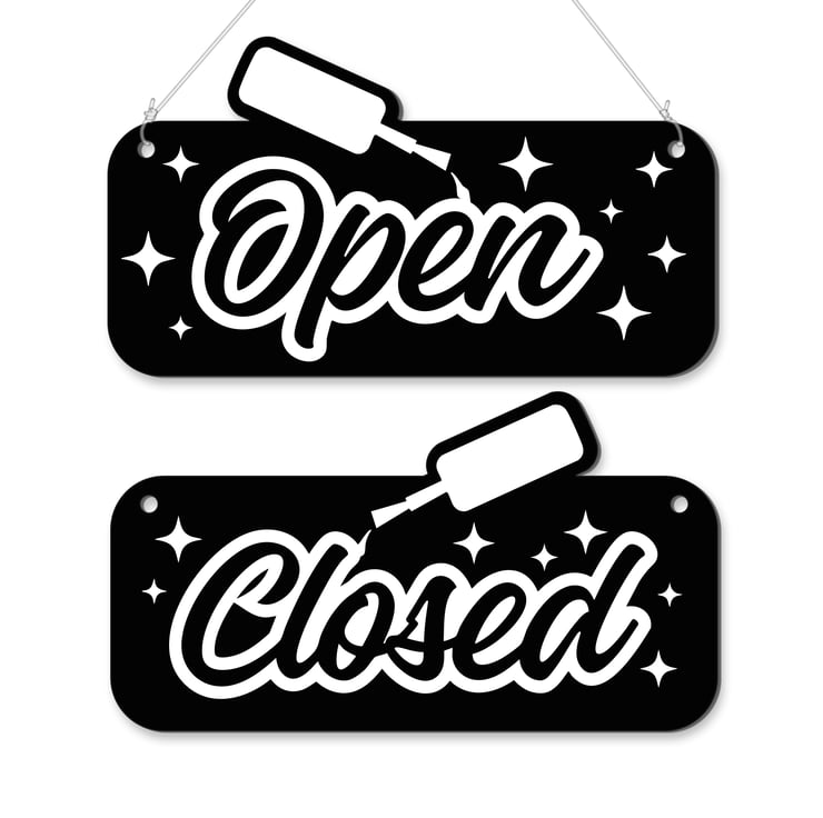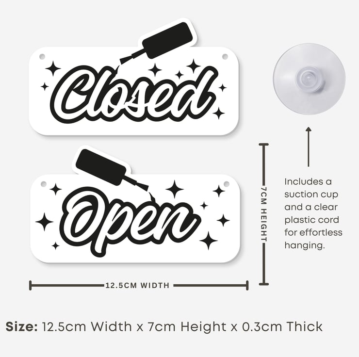 Add a touch of glamour to your nail salon or beauty space with this nail polish bottle open/closed sign. Made from acrylic with a vinyl overlay, this reversible sign is both durable and stylish, featuring sparkling star accents for a fun and modern finish. With “Open” on one side and “Closed” on the other, it’s the perfect accessory for nail techs and beauty professionals. Comes with a suction cup and cord for easy hanging.