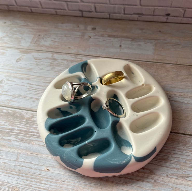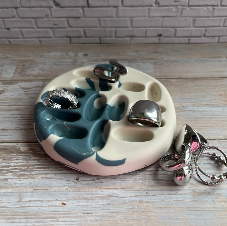 Soft as morning mist, this handcrafted ring holder swirls smoke blue and white in a calming dance of colour and texture. Made from eco-conscious Jesmonite and finished with natural beeswax for a subtle, silky sheen, it’s a small yet striking piece that brings quiet beauty to any bedroom.
