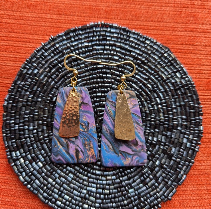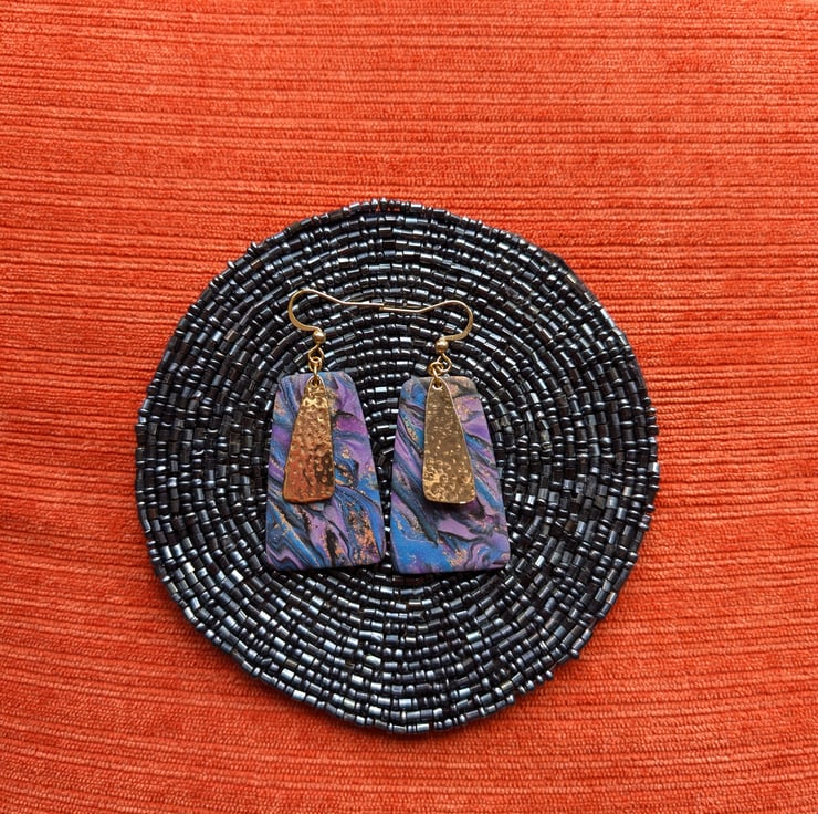 Hand made polymer clay earrings with an abstract pattern and gold embellishment. Fixing is hypo allergenic. Please see all photos for close up detail. All products handmade therefore there may be minor imperfections. Each pair sold as seen, message for more info